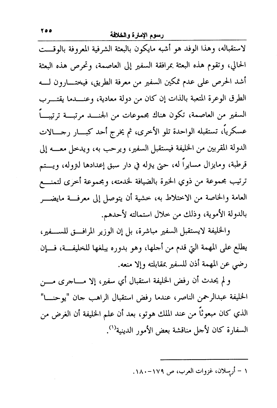 لاستقباله، وهذا الوفد هو أشبه ما يكون بالبعثة الشرفية المعروفة بالوقت الحالي، وتقوم هذه البعثة بمرافقة السفير إلى العاصمة، وتحرص هذه البعثة أشد الحرص على عدم تمكين السفير من معرفة الطريق، فيختارون له الطرق الوعرة المتعبة بالذات إن كان من دولة معادية، وعندما يقترب السفير من العاصمة، تكون هناك مجموعات من الجند مرتبة ترتيباً عسكرياً، تستقبله الواحدة تلو الأخرى، ثم يخرج أحد كبار رجالات الدولة المقربين من الخليفة فيستقبل السفير، ويرحب به، ويدخل معه إلى قرطبة، وما يزال مسايراً له، حتى ينزله في دار سبق إعدادها لنزوله، ويتم ترتيب مجموعة من ذوي الخبرة بالضيافة لخدمته، ومجموعة أخرى لتمنع العامة والخاصة من الاختلاط به، خشية أن يتوصل إلى معرفة ما يضر بالدولة الأموية، وذلك من خلال استمالته لأحدهم.