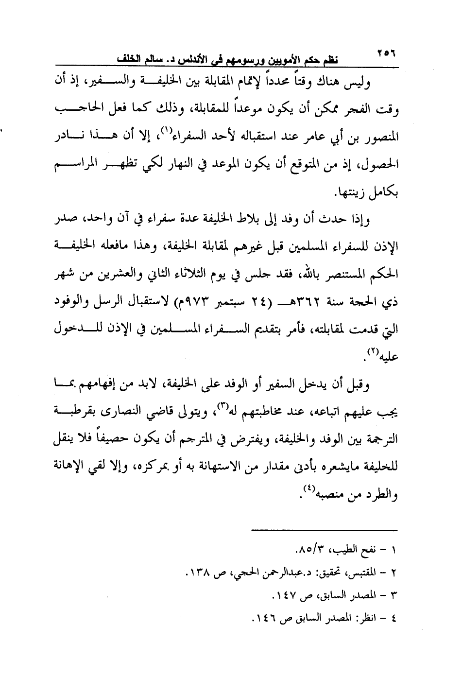 وقبل أن يدخل السفير أو الوفد على الخليفة، لابد من إفهامهم بما يجب عليهم اتباعه، عند مخاطبتهم له3، ويتولى قاضي النصارى بقرطبة الترجمة بين الوفد والخليفة، ويفترض في المترجم أن يكون حصيفاً فلا ينقل للخليفة ما يشعره بأدنى مقدار من الاستهانة به أو بمركزه، وإلا لقي الإهانة والطرد من منصبه4.