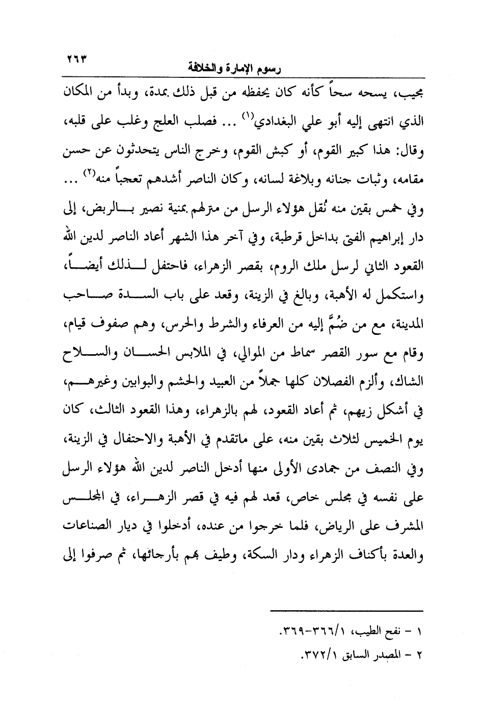 مجيب، يسحه سحاً كأنه كان يحفظه من قبل ذلك بمدة، وبدأ من المكان الذي انتهى إليه أبو علي البغدادي1 ... فصلب العلج وغلب على قلبه، وقال: هذا كبير القوم، أو كبش القوم، وخرج الناس يتحدثون عن حسن مقامه، وثبات جنانه وبلاغة لسانه، وكان الناصر أشدهم تعجباً منه2 ... وفي خمس بقين منه نُقل هؤلاء الرسل من منزلهم بمنية نصير بالربض، إلى دار إبراهيم الفتى بداخل قرطبة، وفي آخر هذا الشهر أعاد الناصر لدين الله القعود الثاني لرسل ملك الروم، بقصر الزهراء، فاحتفل لذلك أيضاً، واستكمل له الأهبة، وبالغ في الزينة، وقعد على باب السدة صاحب المدينة، مع من ضُمَّ إليه من العرفاء والشرط والحرس، وهم صفوف قيام، وقام مع سور القصر سماط من الموالي، في الملابس الحسان والسلاح الشاك، وألزم الفصلان كلها جملاً من العبيد والحشم والبوابين وغيرهم، في أشكل زيهم، ثم أعاد القعود، لهم بالزهراء، وهذا القعود الثالث، كان يوم الخميس لثلاث بقين منه، على ما تقدم في الأهبة والاحتفال في الزينة، وفي النصف من جمادى الأولى منها أدخل الناصر لدين الله هؤلاء الرسل على نفسه في مجلس خاص، قعد لهم فيه في قصر الزهراء، في المجلس المشرف على الرياض، فلما خرجوا من عنده، أدخلوا في ديار الصناعات والعدة بأكناف الزهراء ودار السكة، وطيف بهم بأرجائها، ثم صرفوا إلى