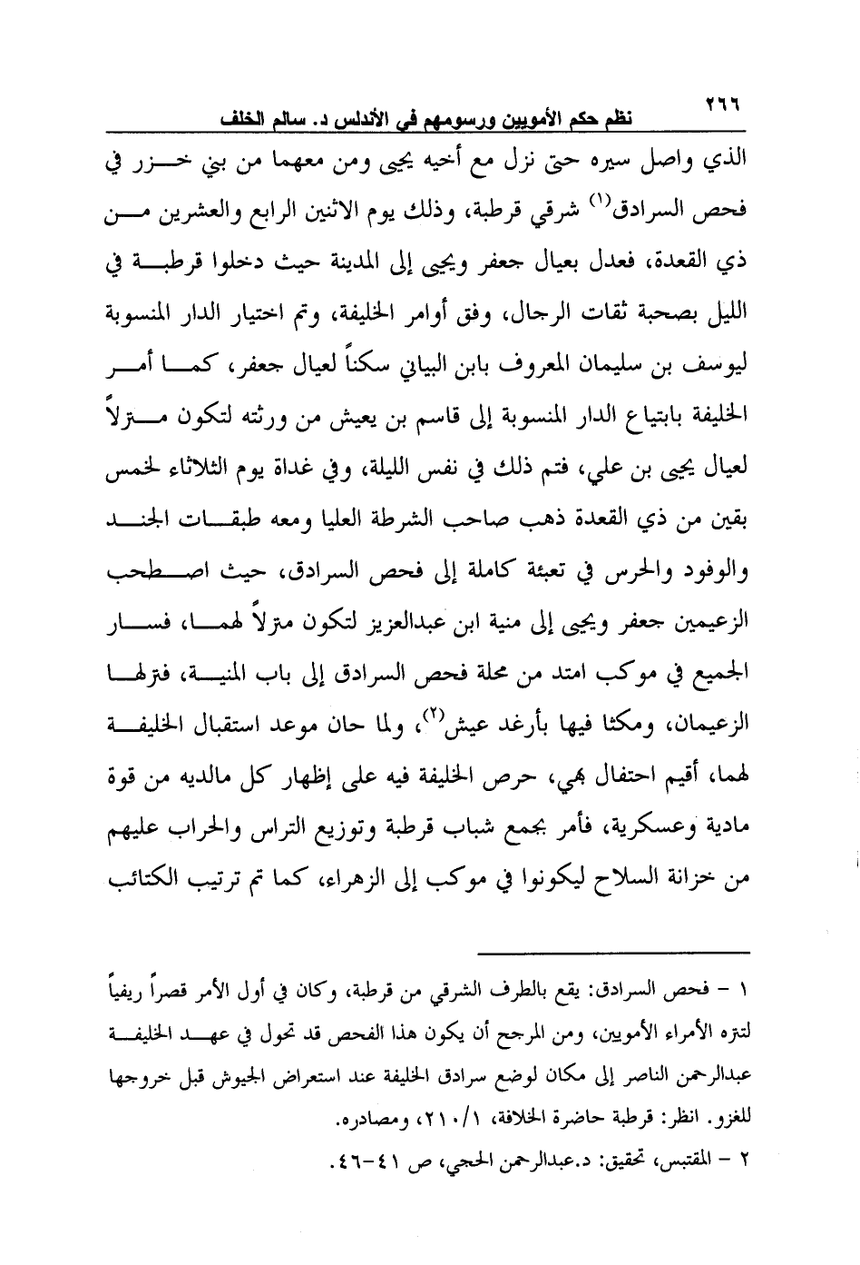 الذي واصل سيره حتى نزل مع أخيه يحيى ومن معهما من بني خزر في فحص السرادق1 شرقي قرطبة، وذلك يوم الاثنين الرابع والعشرين من ذي القعدة، فعدل بعيال جعفر ويحيى إلى المدينة حيث دخلوا قرطبة في الليل بصحبة ثقات الرجال، وفق أوامر الخليفة، وتم اختيار الدار المنسوبة ليوسف بن سليمان المعروف بابن البياني سكناً لعيال جعفر، كما أمر الخليفة بابتياع الدار المنسوبة إلى قاسم بن يعيش من ورثته لتكون منزلاً لعيال يحيى بن علي، فتم ذلك في نفس الليلة، وفي غداة يوم الثلاثاء لخمس بقين من ذي القعدة ذهب صاحب الشرطة العليا ومعه طبقات الجند والوفود والحرس في تعبئة كاملة إلى فحص السرادق، حيث اصطحب الزعيمين جعفر ويحيى إلى منية ابن عبد العزيز لتكون منزلاً لهما، فسار الجميع في موكب امتد من محلة فحص السرادق إلى باب المنية، فنزلها الزعيمان، ومكثا فيها بأرغد عيش2، ولما حان موعد استقبال الخليفة لهما، أقيم احتفال بهي، حرص الخليفة فيه على إظهار كل ما لديه من قوة مادية وعسكرية، فأمر بجمع شباب قرطبة وتوزيع التراس والحراب عليهم من خزانة السلاح ليكونوا في موكب إلى الزهراء، كما تم ترتيب الكتائب