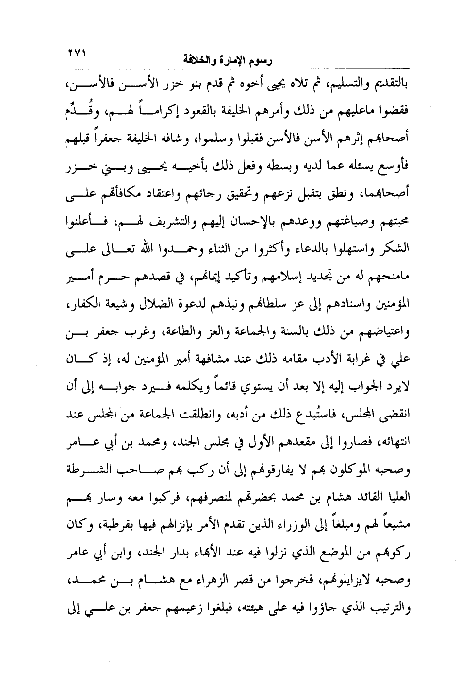 بالتقديم والتسليم، ثم تلاه يحيى أخوه ثم قدم بنو خزر الأسن فالأسن، فقضوا ما عليهم من ذلك وأمرهم الخليفة بالقعود إكراماً لهم، وقُدِّم أصحابهم إثرهم الأسن فالأسن فقبلوا وسلموا، وشافه الخليفة جعفراً قبلهم فأوسع يسأله عما لديه وبسطه وفعل ذلك بأخيه يحيى وبني خزر أصحابهما، ونطق بتقبل نزعهم وتحقيق رجائهم واعتقاد مكافأتهم على محبتهم وصياغتهم ووعدهم بالإحسان إليهم والتشريف لهم، فأعلنوا الشكر واستهلوا بالدعاء وأكثروا من الثناء وحمدوا الله تعالى على مامنحهم له من تجديد إسلامهم وتأكيد إيمانهم، في قصدهم حرم أمير المؤمنين وإسنادهم إلى عز سلطانهم ونبذهم لدعوة الضلال وشيعة الكفار، واعتياضهم من ذلك بالسنة والجماعة والعز والطاعة، وغرب جعفر بن علي في غرابة الأدب مقامه ذلك عند مشافهة أمير المؤمنين له، إذ كان لا يرد الجواب إليه إلا بعد أن يستوي قائماً ويكلمه فيرد جوابه إلى أن انقضى المجلس، فاستُبدع ذلك من أدبه، وانطلقت الجماعة من المجلس عند انتهائه، فصاروا إلى مقعدهم الأول في مجلس الجند، ومحمد بن أبي عامر وصحبه الموكلون بهم لا يفارقونهم إلى أن ركب بهم صاحب الشرطة العليا القائد هشام بن محمد بحضرتهم لمنصرفهم، فركبوا معه وسار بهم مشيعاً لهم ومبلغاً إلى الوزراء الذين تقدم الأمر بإنزالهم فيها بقرطبة، وكان ركوبهم من الموضع الذي نزلوا فيه عند الأبهاء بدار الجند، وابن أبي عامر وصحبه لا يزايلونهم، فخرجوا من قصر الزهراء مع هشام بن محمد، والترتيب الذي جاؤوا فيه على هيئته، فبلغوا زعيمهم جعفر بن علي إلى