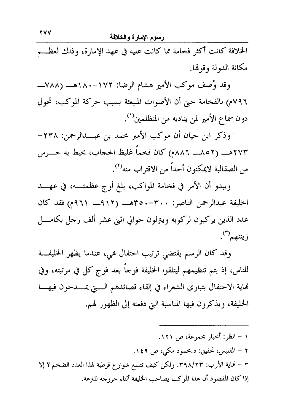 3- نهاية الأرب: 23/398. ولكن كيف تتسع شوارع قرطبة لهذا العدد الضخم؟ إلا إذا كان المقصود أن هذا الموكب يصاحب الخليفة أثناء خروجه للنزهة.