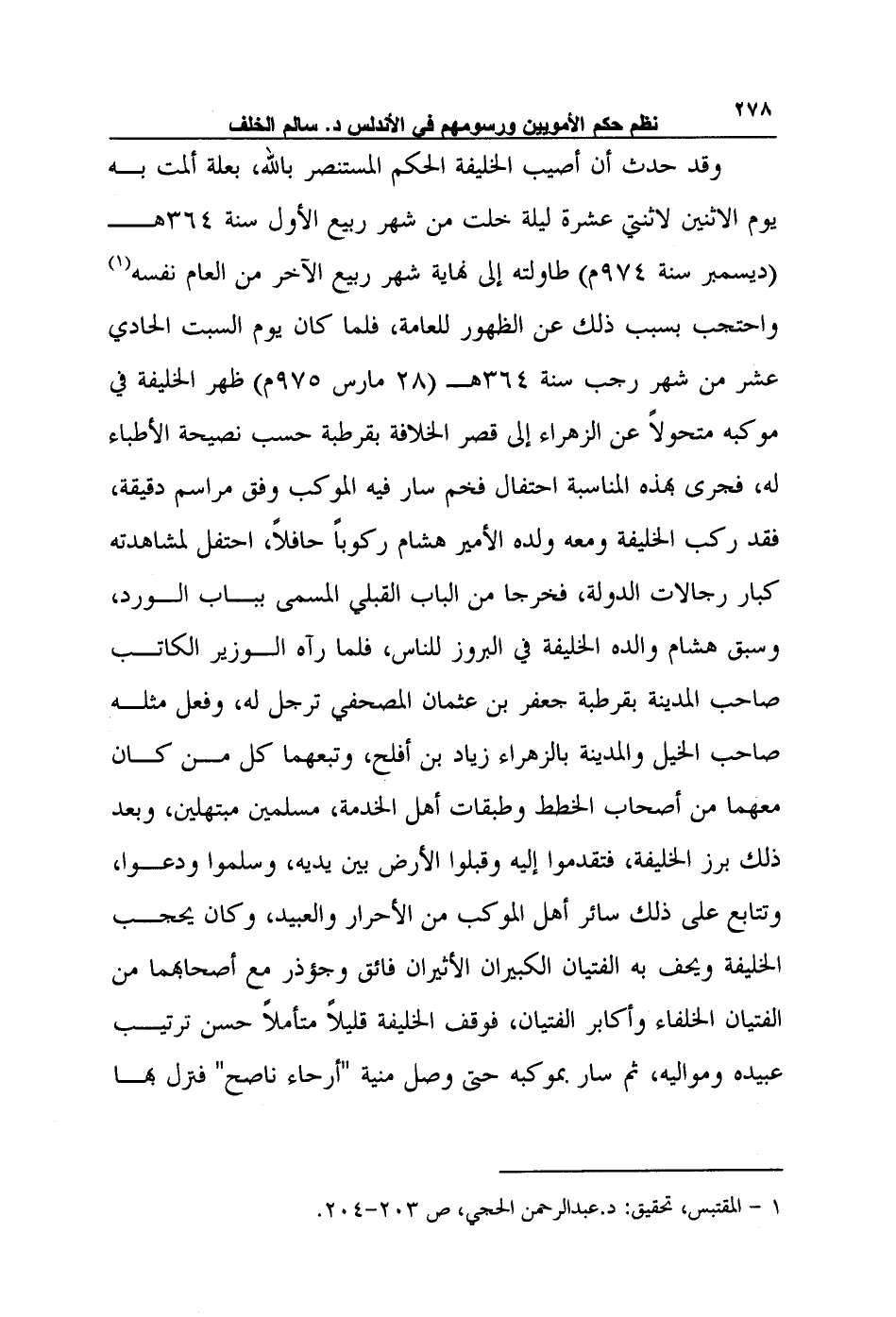 وقد حدث أن أصيب الخليفة الحكم المستنصر بالله، بعلة ألمت به يوم الاثنين لاثنتي عشرة ليلة خلت من شهر ربيع الأول سنة 364هـ (ديسمبر سنة 974م) طاولته إلى نهاية شهر ربيع الآخر من العام نفسه1 واحتجب بسبب ذلك عن الظهور للعامة، فلما كان يوم السبت الحادي عشر من شهر رجب سنة 364هـ (28 مارس 975م) ظهر الخليفة في موكبه متحولاً عن الزهراء إلى قصر الخلافة بقرطبة حسب نصيحة الأطباء له، فجرى بهذه المناسبة احتفال فخم سار فيه الموكب وفق مراسم دقيقة، فقد ركب الخليفة ومعه ولده الأمير هشام ركوباً حافلاً، احتفل لمشاهدته كبار رجالات الدولة، فخرجا من الباب القبلي المسمى بباب الورد، وسبق هشام والده الخليفة في البروز للناس، فلما رآه الوزير الكاتب صاحب المدينة بقرطبة جعفر بن عثمان المصحفي ترجل له، وفعل مثله صاحب الخيل والمدينة بالزهراء زياد بن أفلح، وتبعهما كل من كان معهما من أصحاب الخطط وطبقات أهل الخدمة، مسلمين مبتهلين، وبعد ذلك برز الخليفة، فتقدموا إليه وقبلوا الأرض بين يديه، وسلموا ودعوا، وتتابع على ذلك سائر أهل الموكب من الأحرار والعبيد، وكان يحجب الخليفة ويحف به الفتيان الكبيران الأثيران فائق وجؤذر مع أصحابهما من الفتيان الخلفاء وأكابر الفتيان، فوقف الخليفة قليلاً متأملاً حسن ترتيب عبيده ومواليه، ثم سار بموكبه حتى وصل منية "أرحاء ناصح" فنزل بها