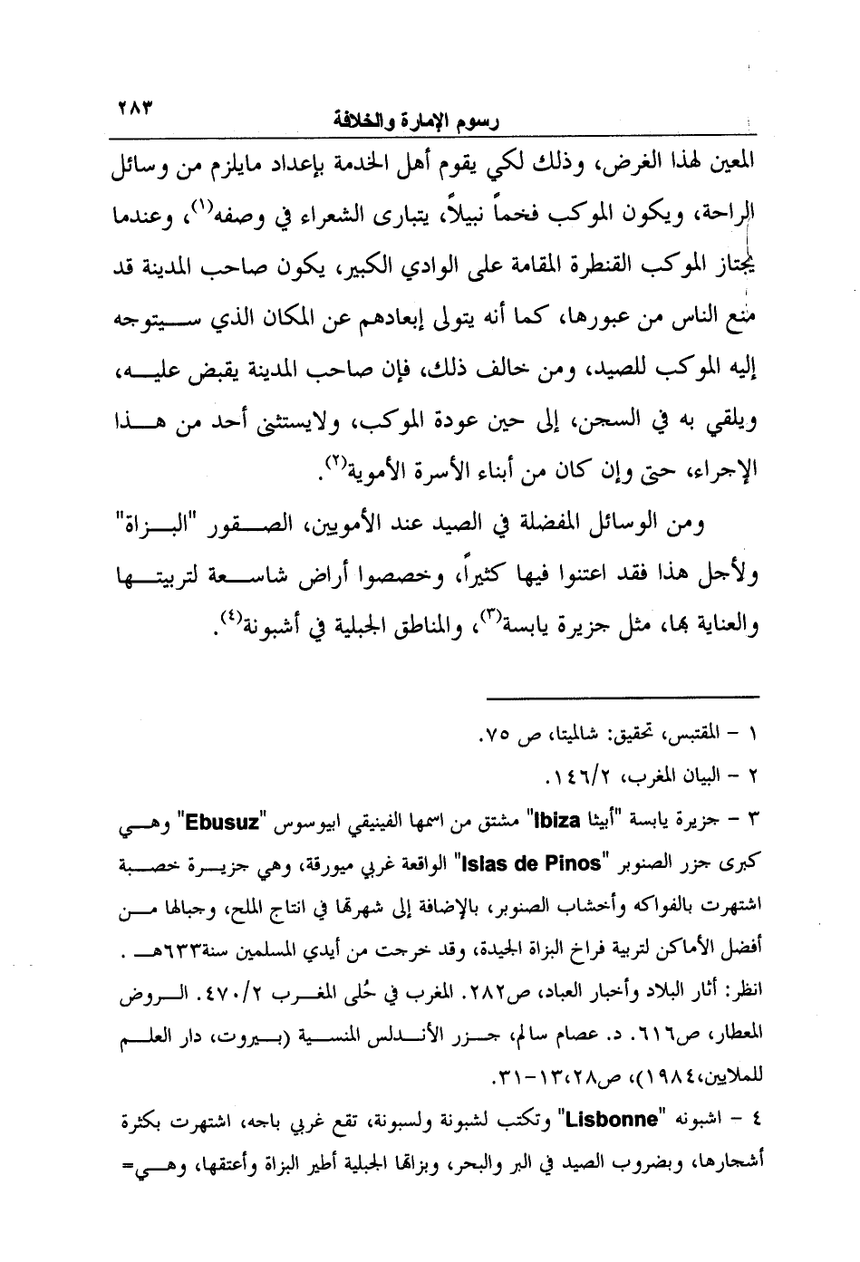 المعين لهذا الغرض، وذلك لكي يقوم أهل الخدمة بإعداد ما يلزم من وسائل الراحة، ويكون الموكب فخماً نبيلاً، يتبارى الشعراء في وصفه1، وعندما يجتاز الموكب القنطرة المقامة على الوادي الكبير، يكون صاحب المدينة قد منع الناس من عبورها، كما أنه يتولى إبعادهم عن المكان الذي سيتوجه إليه الموكب للصيد، ومن خالف ذلك، فإن صاحب المدينة يقبض عليه، ويلقي به في السجن، إلى حين عودة الموكب، ولا يستثنى أحد من هذا الإجراء، حتى وإن كان من أبناء الأسرة الأموية2.