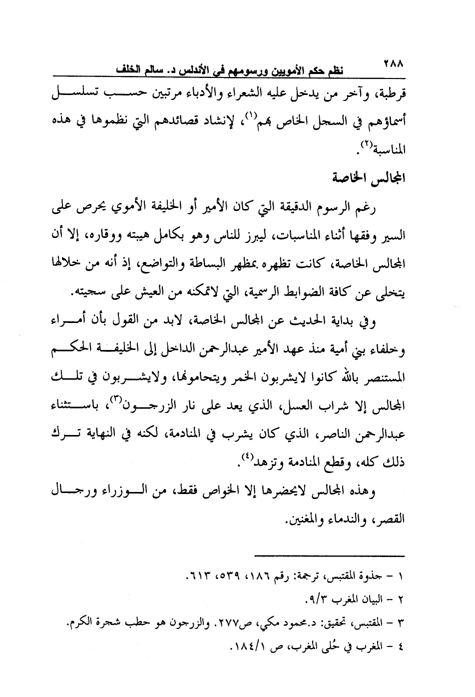 وفي بداية الحديث عن المجالس الخاصة، لابد من القول بأن أمراء وخلفاء بني أمية منذ عهد الأمير عبد الرحمن الداخل إلى الخليفة الحكم المستنصر بالله كانوا لا يشربون الخمر ويتحامونها، ولا يشربون في تلك المجالس إلا شراب العسل، الذي يعد على نار الزرجون3، باستثناء عبد الرحمن الناصر، الذي كان يشرب في المنادمة، لكنه في النهاية ترك ذلك كله، وقطع المنادمة وتزهد4.