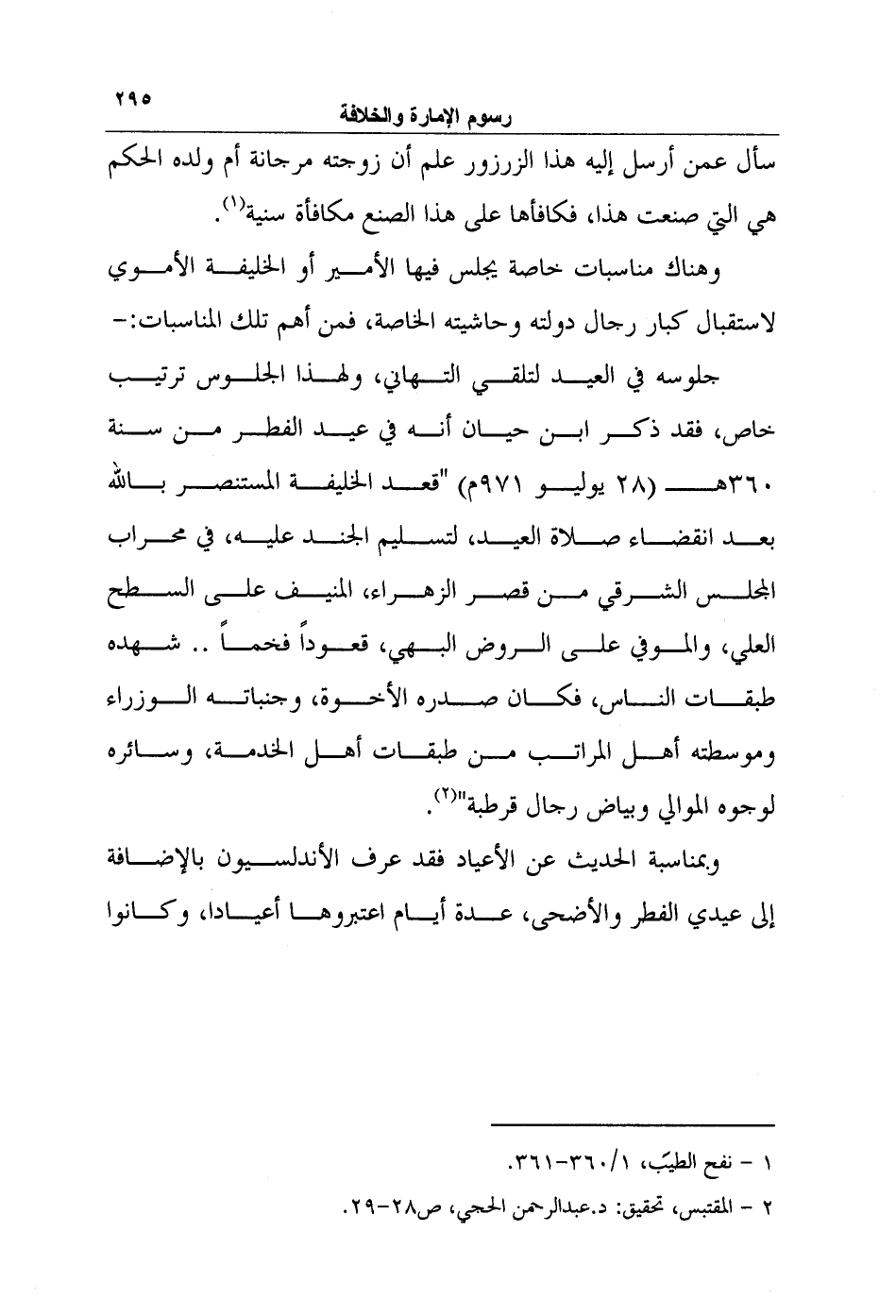 جلوسه في العيد لتلقي التهاني، ولهذا الجلوس ترتيب خاص، فقد ذكر ابن حيان أنه في عيد الفطر من سنة 360هـ (28 يوليو 971م) "قعد الخليفة المستنصر بالله بعد انقضاء صلاة العيد، لتسليم الجند عليه، في محراب المجلس الشرقي من قصر الزهراء، المنيف على السطح العلي، والموفي على الروض البهي، قعوداً فخماً.. شهده طبقات الناس، فكان صدره الأخوة، وجنباته الوزراء وموسطته أهل المراتب من طبقات أهل الخدمة، وسائره لوجوه الموالي وبياض رجال قرطبة"2.