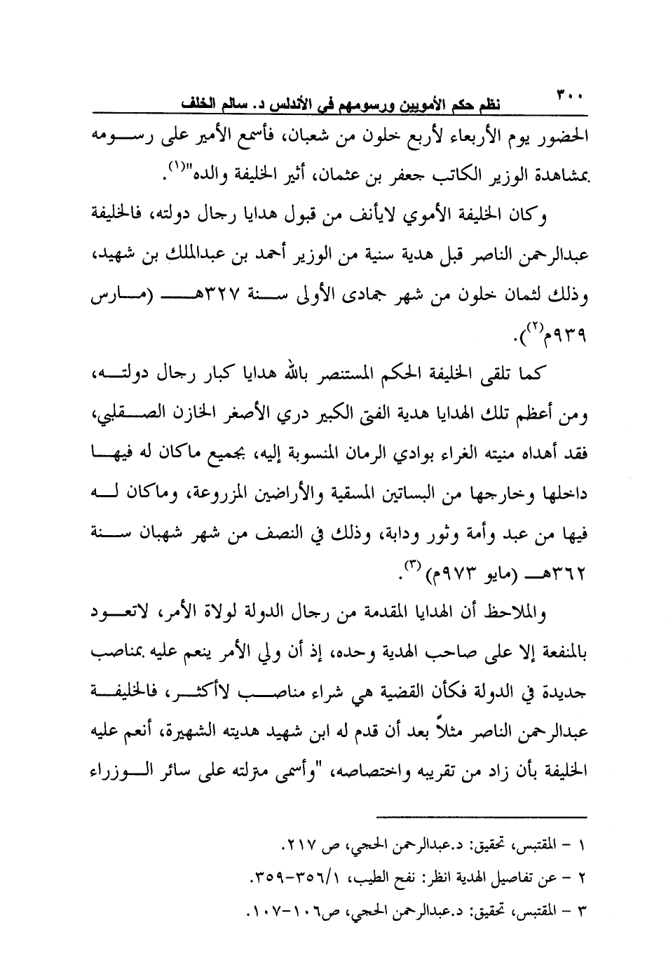 وكان الخليفة الأموي لا يأنف من قبول هدايا رجال دولته، فالخليفة عبد الرحمن الناصر قبل هدية سنية من الوزير أحمد بن عبد الملك بن شهيد، وذلك لثمان خلون من شهر جمادى الأولى سنة 327هـ (مارس 939م2) .