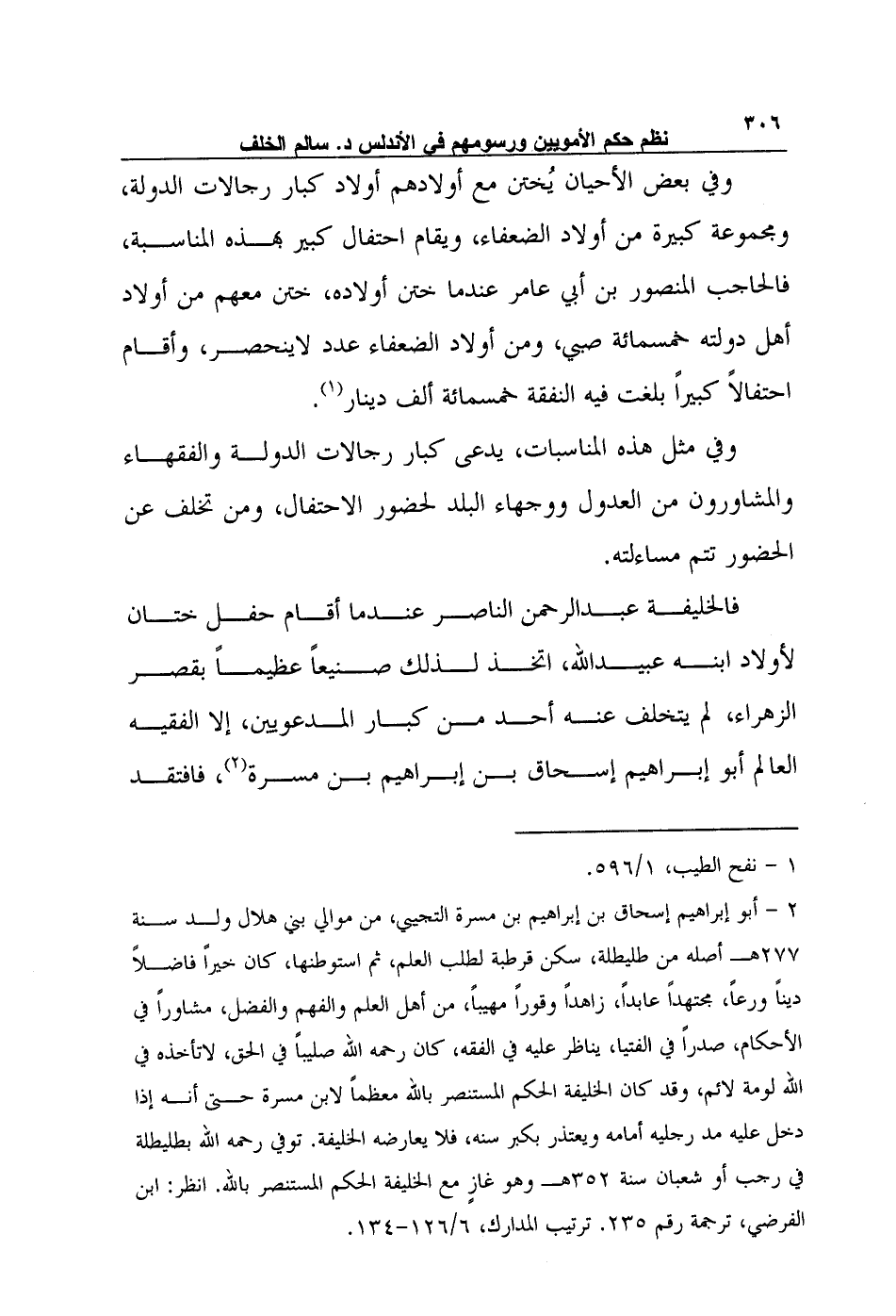 فالخليفة عبد الرحمن الناصر عندما أقام حفل ختان لأولاد ابنه عبيد الله، اتخذ لذلك صنيعاً عظيماً بقصر الزهراء، لم يتخلف عنه أحد من كبار المدعويين، إلا الفقيه العالم أبو إبراهيم إسحاق بن إبراهيم بن مسرة2، فافتقد