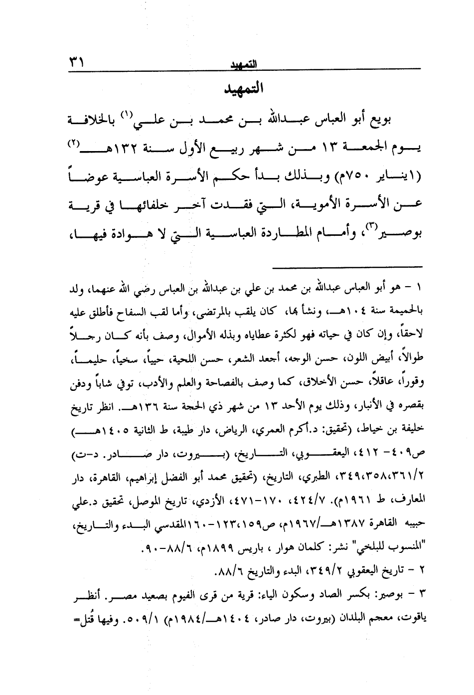 1- هو أبو العباس عبد الله بن محمد بن علي بن عبد الله بن العباس رضي الله عنهما، ولد بالحميمة سنة 104هـ، ونشأ بها، كان يلقب بالمرتضى، وأما لقب السفاح فأطلق عليه لاحقاً، وإن كان في حياته فهو لكثرة عطاياه وبذله الأموال، وصف بأنه كان رجلاً طوالاً، أبيض اللون، حسن الوجه، أجعد الشعر، حسن اللحية، حيياً، سخياً، حليماً، وقوراً، عاقلاً، حسن الأخلاق، كما وصف بالفصاحة والعلم والأدب، توفي شاباً ودفن بقصره في الأنبار، وذلك يوم الأحد 13 من شهر ذي الحجة سنة 136هـ. انظر تاريخ خليفة بن خياط، (تحقيق: د. أكرم العمري، الرياض، دار طيبة، ط الثانية 1405هـ) ص409- 412، اليعقوبي، التاريخ، (بيروت، دار صادر. د-ت) 2/349،358،361، الطبري، التاريخ، (تحقيق محمد أبو الفضل إبراهيم، القاهرة، دار المعارف، ط 1961م) . 7/424، 170-471، الأزدي، تاريخ الموصل، تحقيق د. علي حبيبه القاهرة 1387هـ/1967م، ص123،159-160المقدسي البدء والتاريخ، "المنسوب للبلخي" نشر: كلمان هوار، باريس 1899م، 6/88-90.