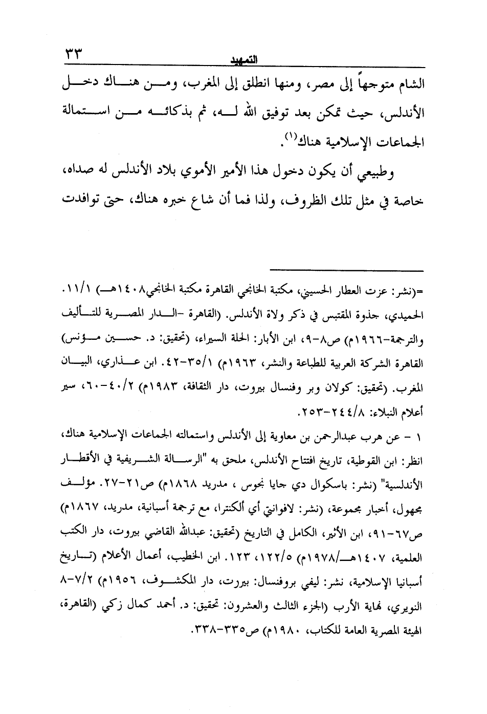 1- عن هرب عبد الرحمن بن معاوية إلى الأندلس واستمالته الجماعات الإسلامية هناك، انظر: ابن القوطية، تاريخ افتتاح الأندلس، ملحق به "الرسالة الشريفية في الأقطار الأندلسية" (نشر: باسكوال دي جايا نجوس، مدريد 1868م) ص21-27. مؤلف مجهول، أخبار مجموعة، (نشر: لا فوانتي أي ألكنترا، مع ترجمة أسبانية، مدريد، 1867م) ص67-91، ابن الأثير، الكامل في التاريخ (تحقيق: عبد الله القاضي بيروت، دار الكتب العلمية، 1407هـ/1978م) 5/122، 123. ابن الخطيب، أعمال الأعلام (تاريخ أسبانيا الإسلامية، نشر: ليفي بروفنسال: بيروت، دار المكشوف، 1956م) 2/7-8 النويري، نهاية الأرب (الجزء الثالث والعشرون: تحقيق: د. أحمد كمال زكي (القاهرة، الهيئة المصرية العامة للكتاب، 1980م) ص335-338.