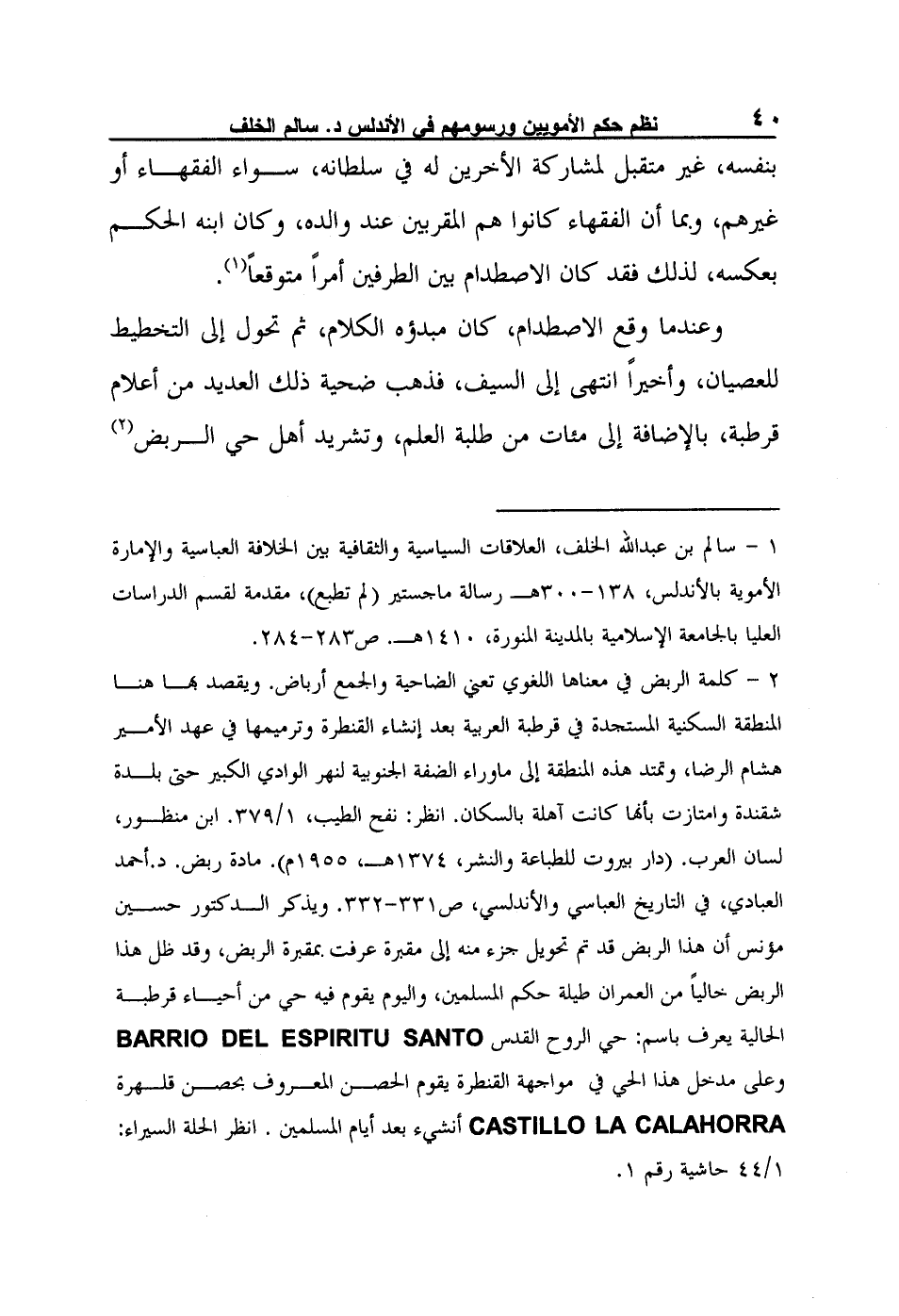 2- كلمة الربض في معناها اللغوي تعني الضاحية والجمع أرباض. ويقصد بها هنا المنطقة السكنية المستجدة في قرطبة العربية بعد إنشاء القنطرة وترميمها في عهد الأمير هشام الرضا، وتمتد هذه المنطقة إلى ما وراء الضفة الجنوبية لنهر الوادي الكبير حتى بلدة شقندة وامتازت بأنها كانت آهلة بالسكان. انظر: نفح الطيب، 1/379. ابن منظور، لسان العرب. (دار بيروت للطباعة والنشر، 1374هـ، 1955م) . مادة ربض. د. أحمد العبادي، في التاريخ العباسي والأندلسي، ص331-332. ويذكر الدكتور حسين مؤنس أن هذا الربض قد تم تحويل جزء منه إلى مقبرة عرفت بمقبرة الربض، وقد ظل هذا الربض خالياً من العمران طيلة حكم المسلمين، واليوم يقوم فيه حي من أحياء قرطبة الحالية يعرف باسم: حي الروح القدس BARRIO DEL ESPIRITU SANTO وعلى مدخل هذا الحي في مواجهة القنطرة يقوم الحصن المعروف بحصن قلهرة CASTILLO LA CALAHORRA أنشيء بعد أيام المسلمين. انظر الحلة السيراء: 1/44 حاشية رقم 1.