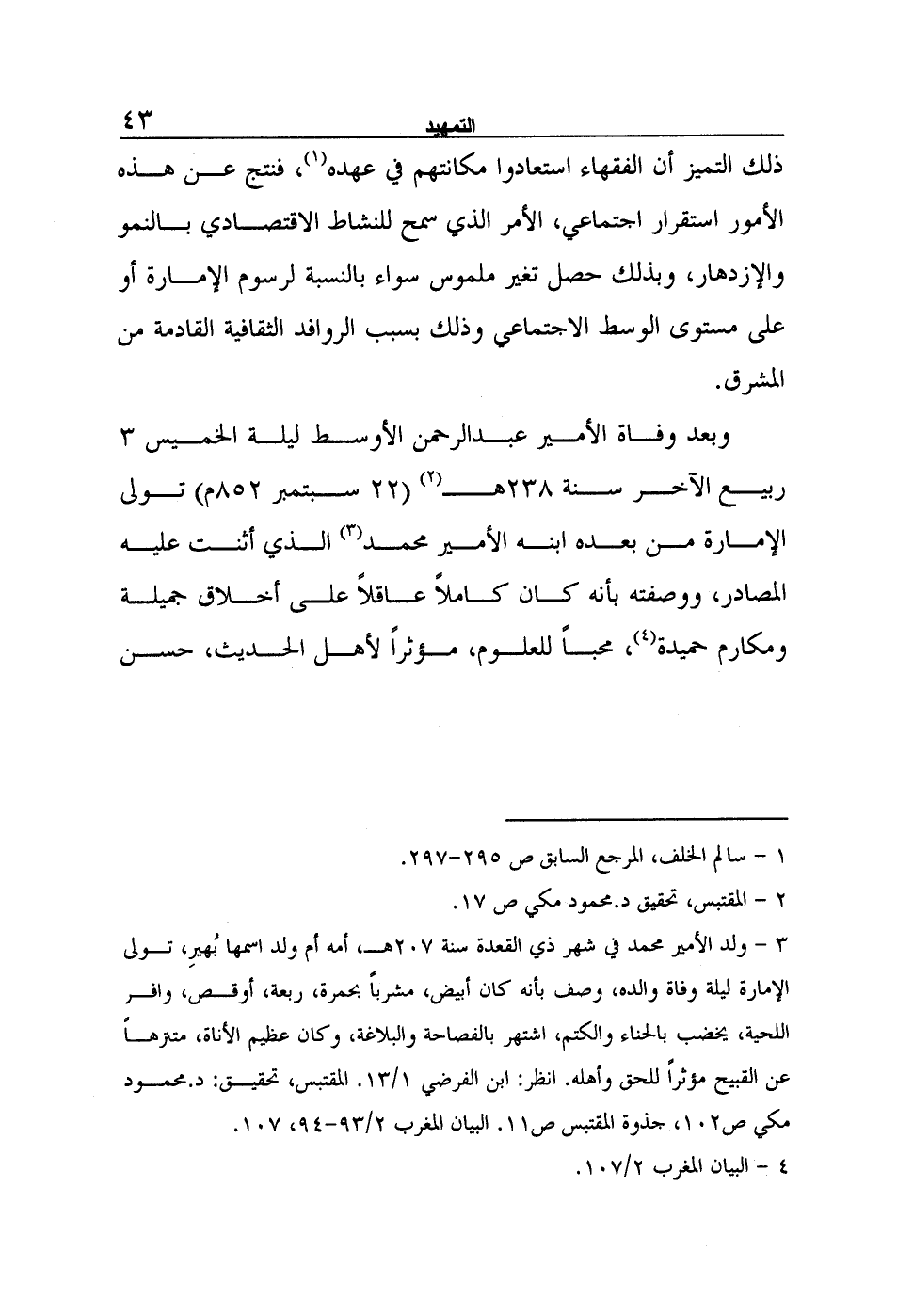 3- ولد الأمير محمد في شهر ذي القعدة سنة 207هـ، أمه أم ولد اسمها بُهيرِ، تولى الإمارة ليلة وفاة والده، وصف بأنه كان أبيض، مشرباً بحمرة، ربعة، أوقص، وافر اللحية، يخضب بالحناء والكتم، اشتهر بالفصاحة والبلاغة، وكان عظيم الأناة، متنزهاً عن القبيح مؤثراً للحق وأهله. انظر: ابن الفرضي 1/13. المقتبس، تحقيق: د. محمود مكي ص102، جذوة المقتبس ص11. البيان المغرب 2/93-94، 107.