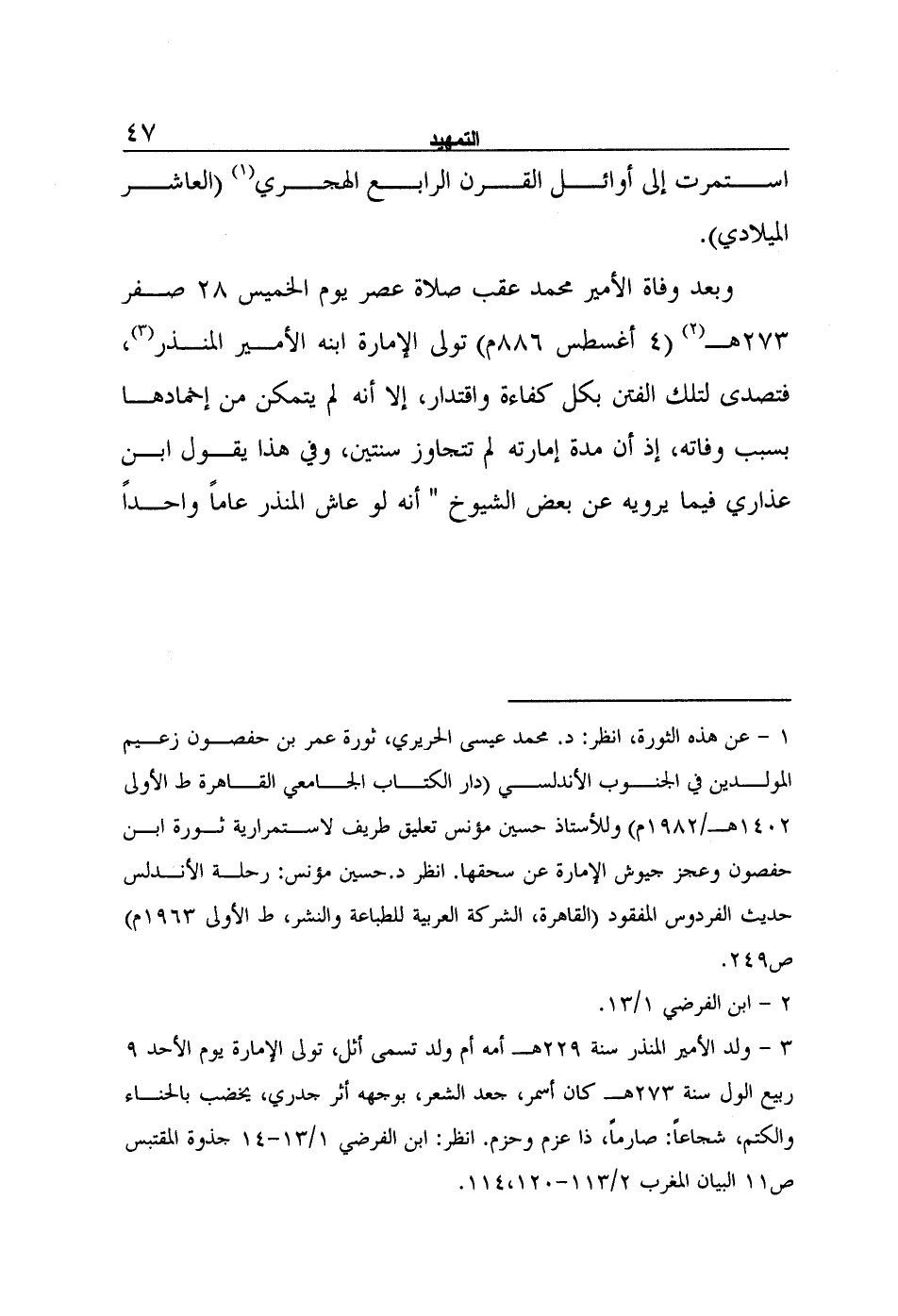1- عن هذه الثورة، انظر: د. محمد عيسى الحريري، ثورة عمر بن حفصون زعيم المولدين في الجنوب الأندلسي (دار الكتاب الجامعي القاهرة ط الأولى 1402هـ/1982م) وللأستاذ حسين مؤنس تعليق طريف لاستمرارية ثورة ابن حفصون وعجز جيوش الإمارة عن سحقها. انظر د. حسين مؤنس: رحلة الأندلس حديث الفردوس المفقود (القاهرة، الشركة العربية للطباعة والنشر، ط الأولى 1963م) ص249.