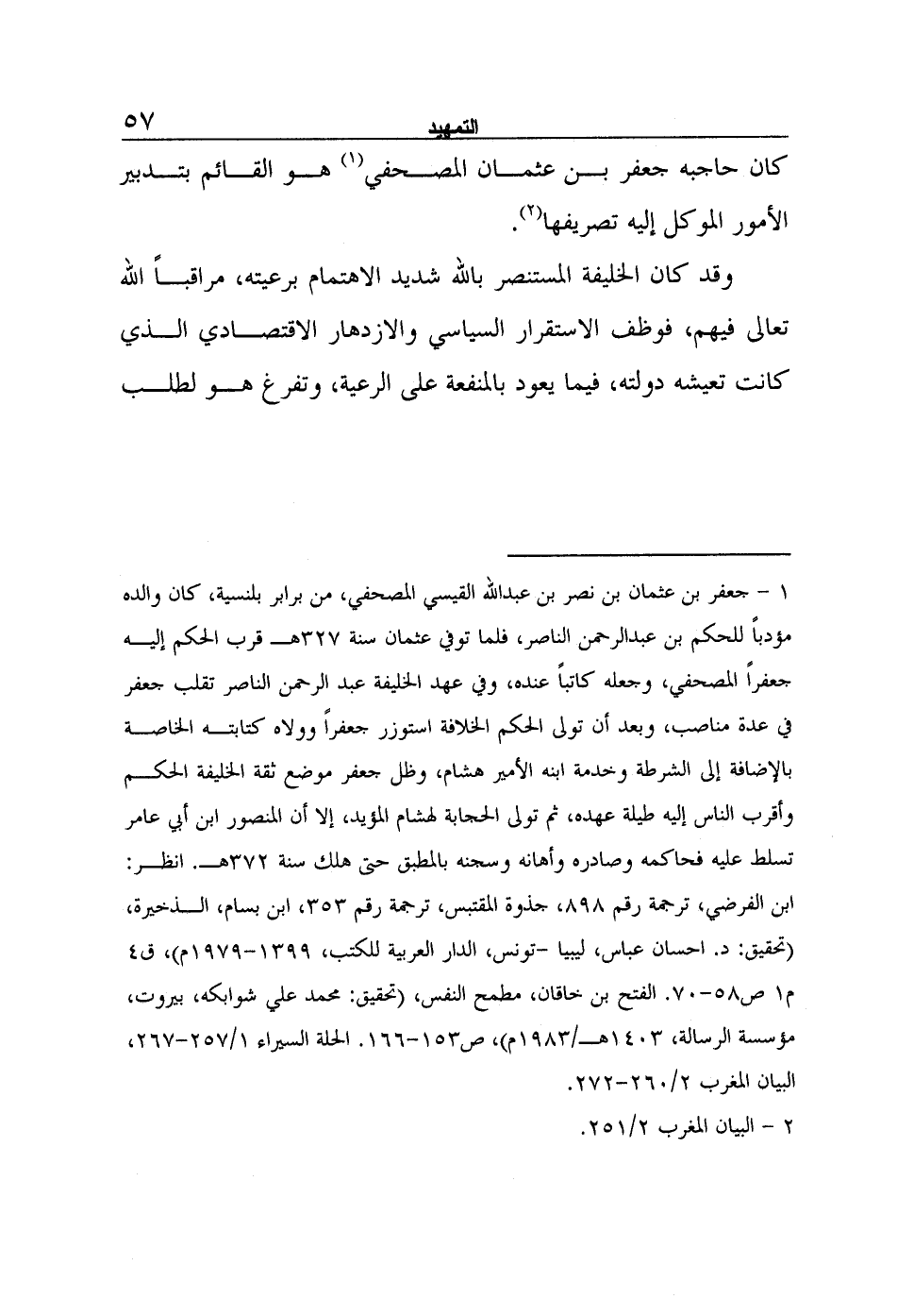 1- جعفر بن عثمان بن نصر بن عبد الله القيسي المصحفي، من برابر بلنسية، كان والده مؤدباً للحكم بن عبد الرحمن الناصر، فلما توفي عثمان سنة 327هـ قرب الحكم إليه جعفراً المصحفي، وجعله كاتباً عنده، وفي عهد الخليفة عبد الرحمن الناصر تقلب جعفر في عدة مناصب، وبعد أن تولى الحكم الخلافة استوزر جعفراً وولاه كتابته الخاصة بالإضافة إلى الشرطة وخدمة ابنه الأمير هشام، وظل جعفر موضع ثقة الخليفة الحكم وأقرب الناس إليه طيلة عهده، ثم تولى الحجابة لهشام المؤيد، إلا أن المنصور ابن أبي عامر تسلط عليه فحاكمه وصادره وأهانه وسجنه بالمطبق حتى هلك سنة 372هـ. انظر: ابن الفرضي، ترجمة رقم 898، جذوة المقتبس، ترجمة رقم 353، ابن بسام، الذخيرة، (تحقيق: د. إحسان عباس، ليبيا -تونس، الدار العربية للكتب، 1399-1979م) ، ق4 م1 ص58-70. الفتح بن خاقان، مطمح النفس، (تحقيق: محمد علي شوابكه، بيروت، مؤسسة الرسالة، 1403هـ/1983م) ، ص153-166. الحلة السيراء 1/257-267، البيان المغرب 2/260-272.