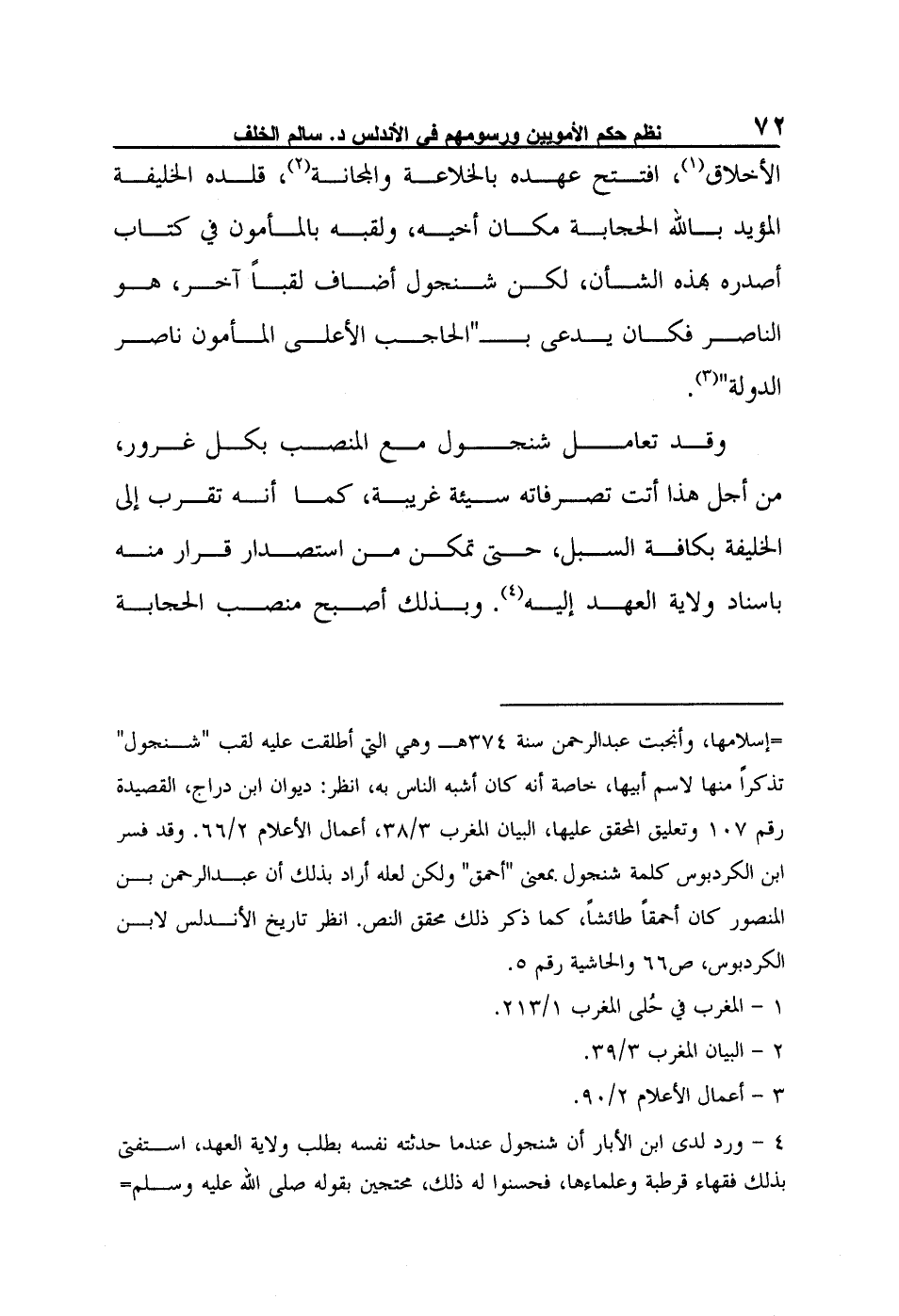 وقد تعامل شنجول مع المنصب بكل غرور، من أجل هذا أتت تصرفاته سيئة غريبة، كما أنه تقرب إلى الخليفة بكافة السبل، حتى تمكن من استصدار قرار منه باسناد ولاية العهد إليه4. وبذلك أصبح منصب الحجابة