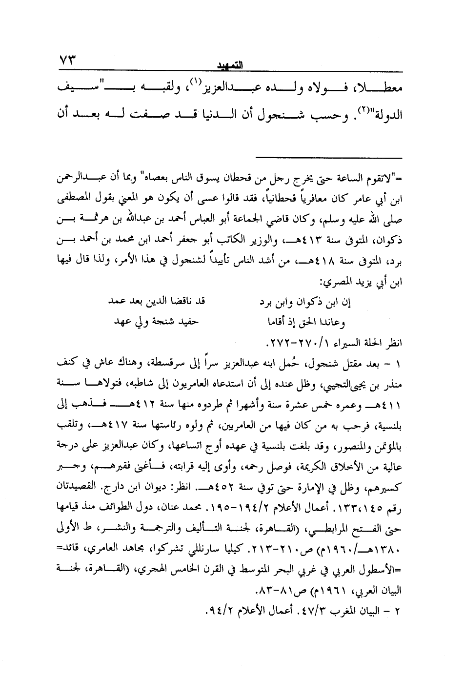 1- بعد مقتل شنجول، حُمل ابنه عبد العزيز سراً إلى سرقسطة، وهناك عاش في كنف منذر بن يحيى التجيبي، وظل عنده إلى أن استدعاه العامريون إلى شاطبه، فتولاها سنة 411هـ وعمره خمس عشرة سنة وأشهرا ثم طردوه منها سنة 412هـ فذهب إلى بلنسية، فرحب به من كان فيها من العامريين، ثم ولوه رئاستها سنة 417هـ، وتلقب بالمؤتمن والمنصور، وقد بلغت بلنسية في عهده أوج اتساعها، وكان عبد العزيز على درجة عالية من الأخلاق الكريمة، فوصل رحمه، وأوى إليه قرابته، فأغنى فقيرهم، وجبر كسيرهم، وظل في الإمارة حتى توفي سنة 452هـ. انظر: ديوان ابن دارج. القصيدتان رقم 133،145. أعمال الأعلام 2/194-195. محمد عنان، دول الطوائف منذ قيامها حتى الفتح المرابطي، (القاهرة، لجنة التأليف والترجمة والنشر، ط الأولى 1380هـ/1960م) ص210-213. كيليا سارنللي تشركوا، مجاهد العامري، قائد الأسطول العربي في غربي البحر المتوسط في القرن الخامس الهجري، (القاهرة، لجنة البيان العربي، 1961م) ص81-83.