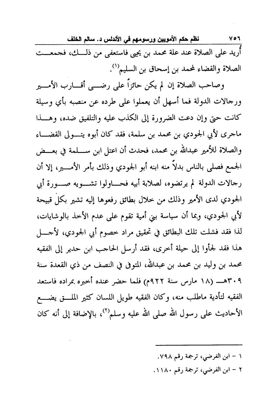 وصاحب الصلاة إن لم يكن حائزاً على رضى أقارب الأمير ورجالات الدولة فما أسهل أن يعملوا على طرده عن منصبه بأي وسيلة كانت حتى وإن دعت الضرورة إلى الكذب عليه والتلفيق ضده، وهذا ما جرى لأبي الجودي بن محمد بن سلمة، فقد كان أبوه يتولى القضاء والصلاة للأمير عبد الله بن محمد، فحدث أن اعتل ابن سلمة في بعض الجمع فصلى بالناس بدلاً منه ابنه أبو الجودي وذلك بأمر الأمير، إلا أن رجالات الدولة لم يرتضوه، لصلابة أبيه فحاولوا تشويه صورة أبي الجودي لدى الأمير وذلك من خلال بطائق رفعوها إليه تشير بكل قبيحة لأبي الجودي، وبما أن سياسة بني أمية تقوم على عدم الأخذ بالوشايات، لذا فقد فشلت تلك البطائق في تحقيق مراد خصوم أبي الجودي، لأجل هذا فقد لجأوا إلى حيلة أخرى، فقد أرسل الحاجب ابن حدير إلى الفقيه محمد بن وليد بن محمد بن عبد الله، المتوفى في النصف من ذي القعدة سنة 309هـ (18 مارس سنة 922م) فلما حضر عنده أخبره بمراده فاستعد الفقيه لتأدية ما طلب منه، وكان الفقيه طويل اللسان كثير الملق يضع الأحاديث على رسول الله صلى الله عليه وسلم2، بالإضافة إلى أنه كان