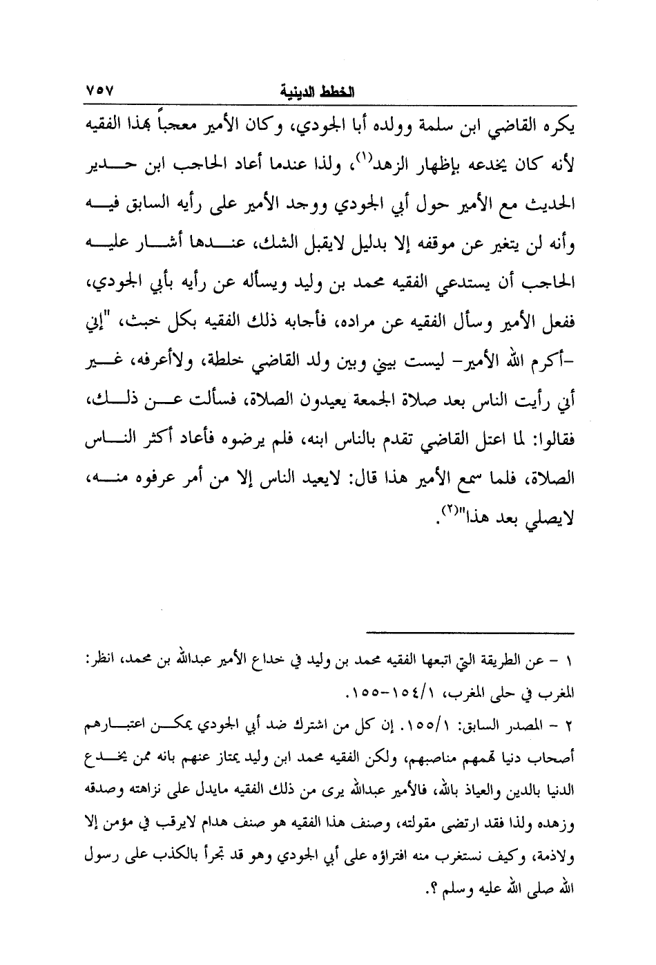 2- المصدر السابق: 1/155. إن كل من اشترك ضد أبي الجودي يمكن اعتبارهم أصحاب دنيا تهمهم مناصبهم، ولكن الفقيه محمد ابن وليد يمتاز عنهم بأنه ممن يخدع الدنيا بالدين والعياذ بالله، فالأمير عبد الله يرى من ذلك الفقيه ما يدل على نزاهته وصدقه وزهده ولذا فقد ارتضى مقولته، وصنف هذا الفقيه هو صنف هدام لا يرقب في مؤمن إلا ولا ذمة، وكيف نستغرب منه افتراؤه على أبي الجودي وهو قد تجرأ بالكذب على رسول الله صلى الله عليه وسلم؟.