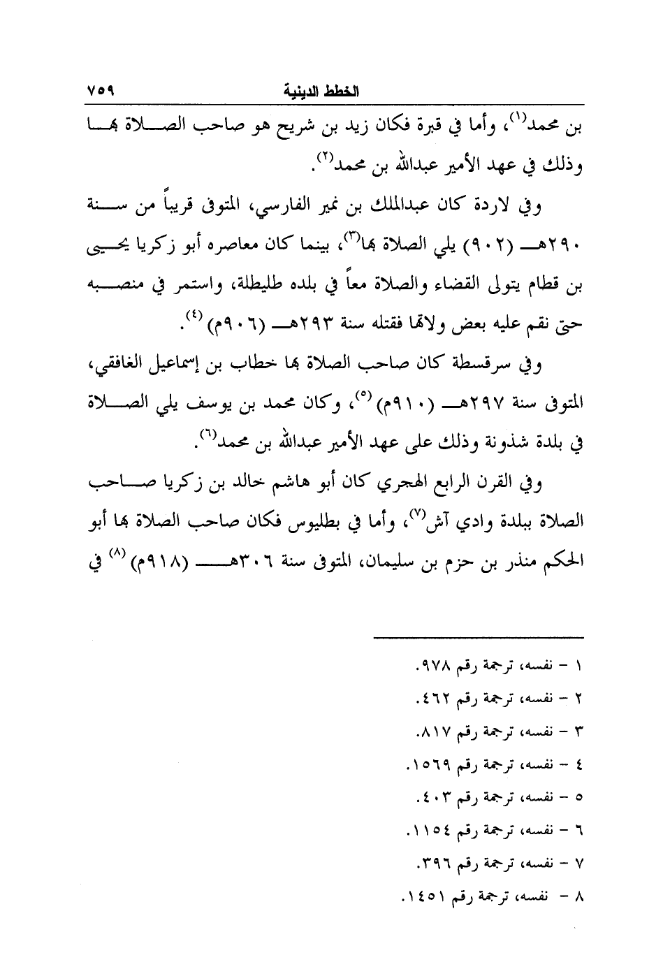 وفي القرن الرابع الهجري كان أبو هاشم خالد بن زكريا صاحب الصلاة ببلدة وادي آش7، وأما في بطليوس فكان صاحب الصلاة بها أبو الحكم منذر بن حزم بن سليمان، المتوفى سنة 306هـ (918م) 8 في