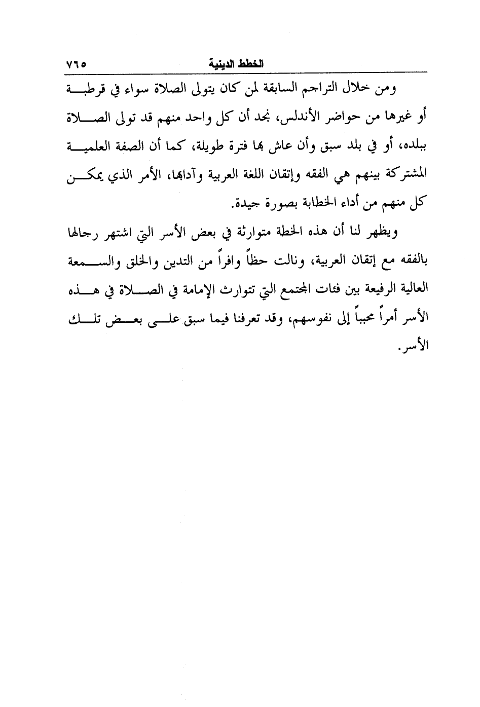 ويظهر لنا أن هذه الخطة متوارثة في بعض الأسر التي اشتهر رجالها بالفقه مع إتقان العربية، ونالت حظاً وافراً من التدين والخلق والسمعة العالية الرفيعة بين فئات المجتمع التي تتوارث الإمامة في الصلاة في هذه الأسر أمراً محبباً إلى نفوسهم، وقد تعرفنا فيما سبق على بعض تلك الأسر.