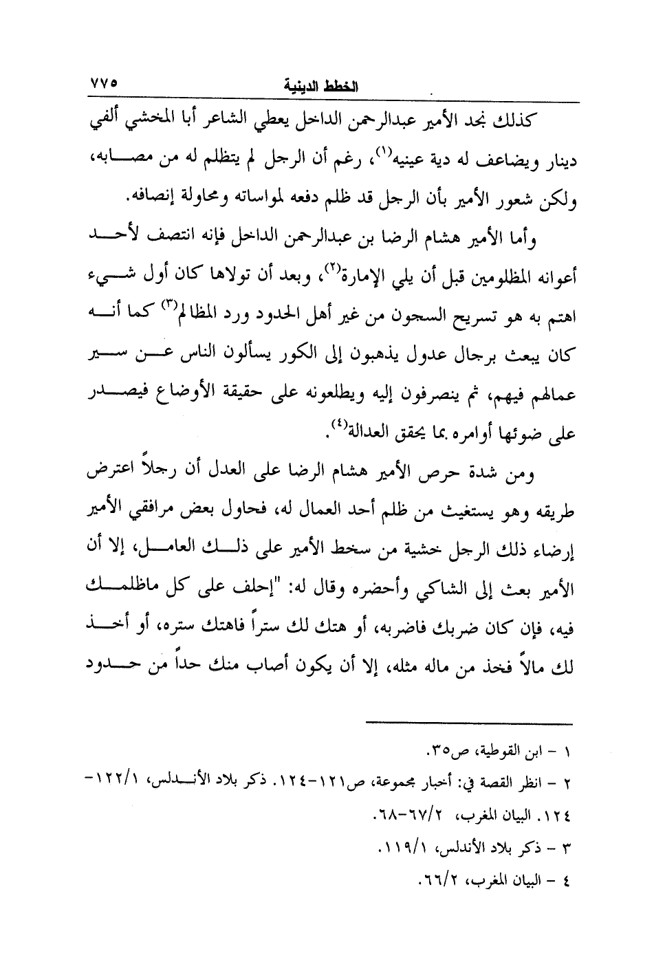 وأما الأمير هشام الرضا بن عبد الرحمن الداخل فإنه انتصف لأحد أعوانه المظلومين قبل أن يلي الإمارة2، وبعد أن تولاها كان أول شيء اهتم به هو تسريح السجون من غير أهل الحدود ورد المظالم3 كما أنه كان يبعث برجال عدول يذهبون إلى الكور يسألون الناس عن سير عمالهم فيهم، ثم ينصرفون إليه ويطلعونه على حقيقة الأوضاع فيصدر على ضوئها أوامره بما يحقق العدالة4.