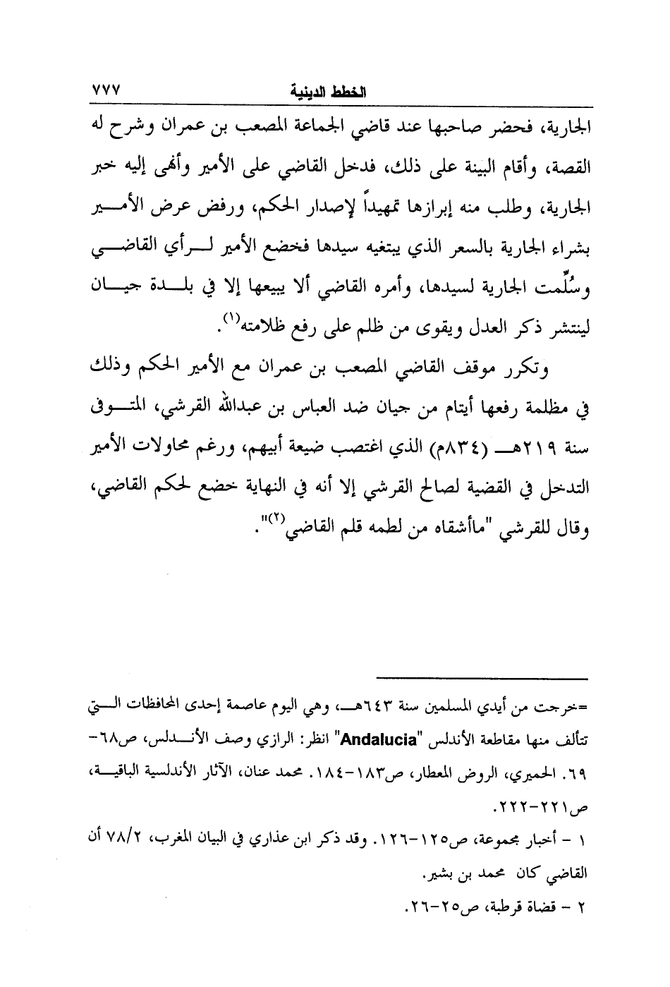 الجارية، فحضر صاحبها عند قاضي الجماعة المصعب بن عمران وشرح له القصة، وأقام البينة على ذلك، فدخل القاضي على الأمير وأنهى إليه خبر الجارية، وطلب منه إبرازها تمهيداً لإصدار الحكم، ورفض عرض الأمير بشراء الجارية بالسعر الذي يبتغيه سيدها فخضع الأمير لرأي القاضي وسُلِّمت الجارية لسيدها، وأمره القاضي ألا يبيعها إلا في بلدة جيان لينتشر ذكر العدل ويقوى من ظلم على رفع ظلامته1.