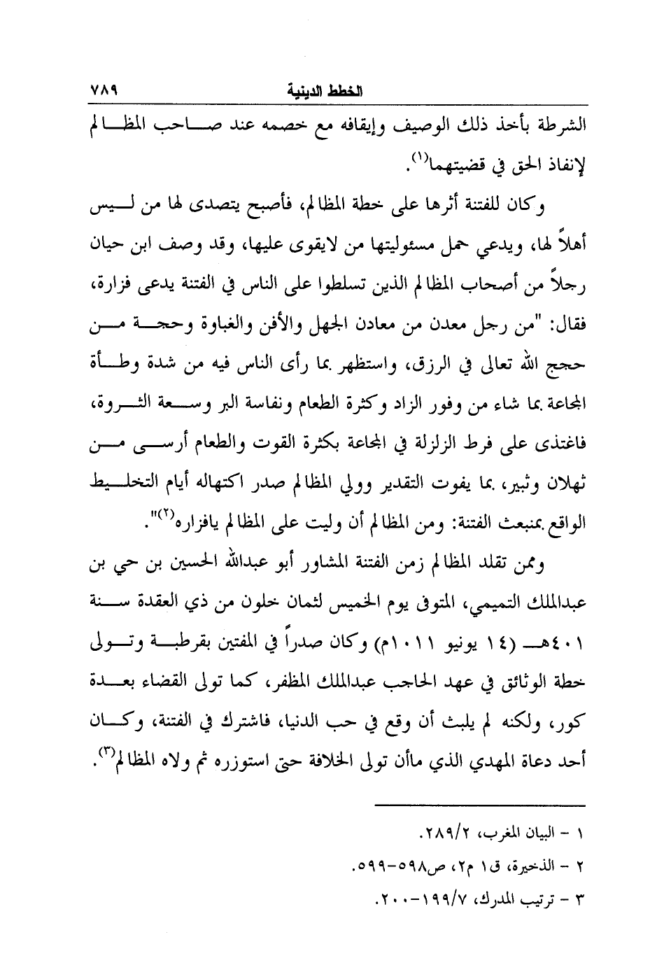 وممن تقلد المظالم زمن الفتنة المشاور أبو عبد الله الحسين بن حي بن عبد الملك التميمي، المتوفى يوم الخميس لثمان خلون من ذي العقدة سنة 401هـ (14 يونيو 1011م) وكان صدراً في المفتين بقرطبة وتولى خطة الوثائق في عهد الحاجب عبد الملك المظفر، كما تولى القضاء بعدة كور، ولكنه لم يلبث أن وقع في حب الدنيا، فاشترك في الفتنة، وكان أحد دعاة المهدي الذي ماأن تولى الخلافة حتى استوزره ثم ولاه المظالم3.
