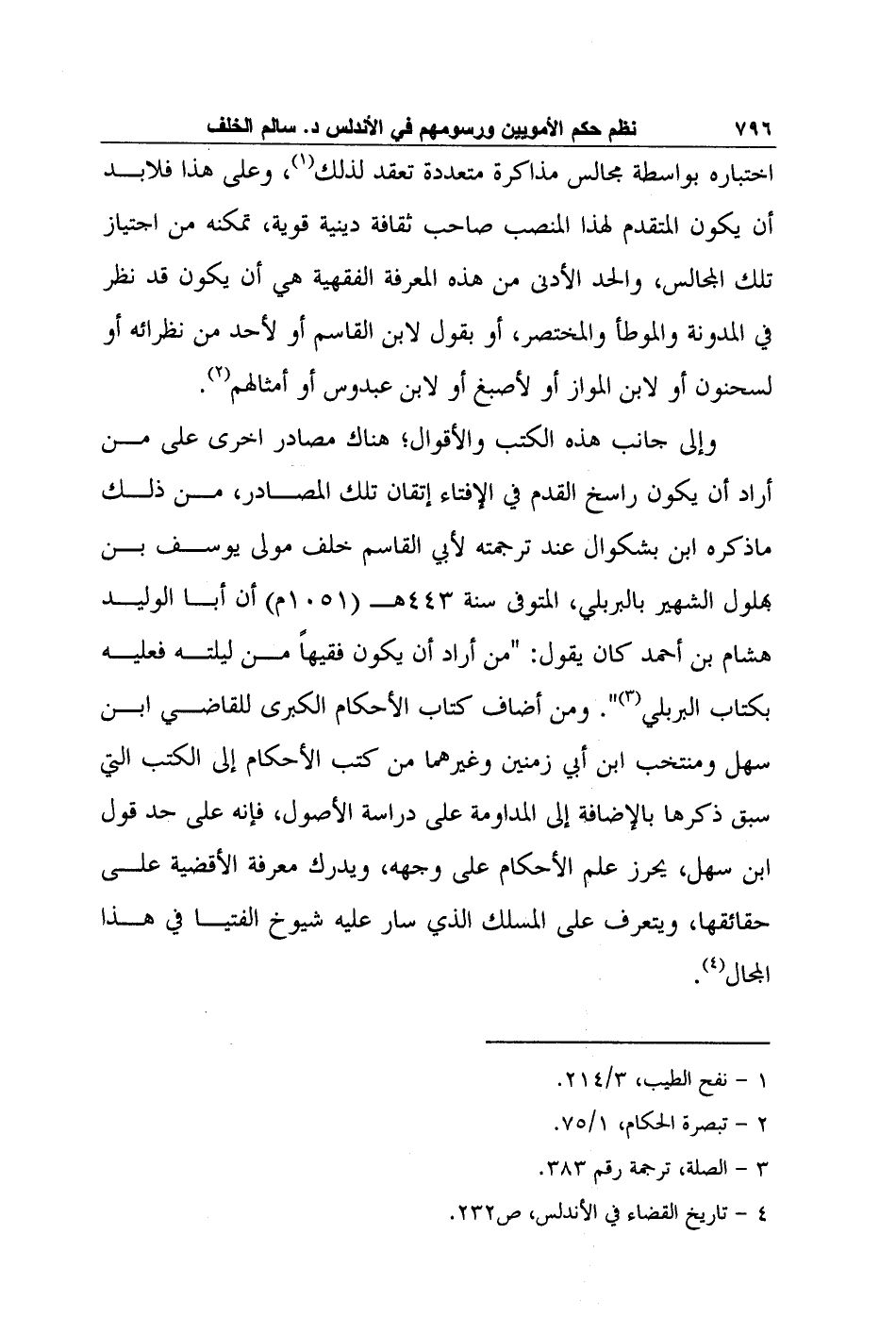 وإلى جانب هذه الكتب والأقوال؛ هناك مصادر أخرى على من أراد أن يكون راسخ القدم في الإفتاء إتقان تلك المصادر، من ذلك ما ذكره ابن بشكوال عند ترجمته لأبي القاسم خلف مولى يوسف بن بهلول الشهير بالبربلي، المتوفى سنة 443هـ (1051م) أن أبا الوليد هشام بن أحمد كان يقول: "من أراد أن يكون فقيهاً من ليلته فعليه بكتاب البربلي3". ومن أضاف كتاب الأحكام الكبرى للقاضي ابن سهل ومنتخب ابن أبي زمنين وغيرهما من كتب الأحكام إلى الكتب التي سبق ذكرها بالإضافة إلى المداومة على دراسة الأصول، فإنه على حد قول ابن سهل، يحرز علم الأحكام على وجهه، ويدرك معرفة الأقضية على حقائقها، ويتعرف على المسلك الذي سار عليه شيوخ الفتيا في هذا المجال4.