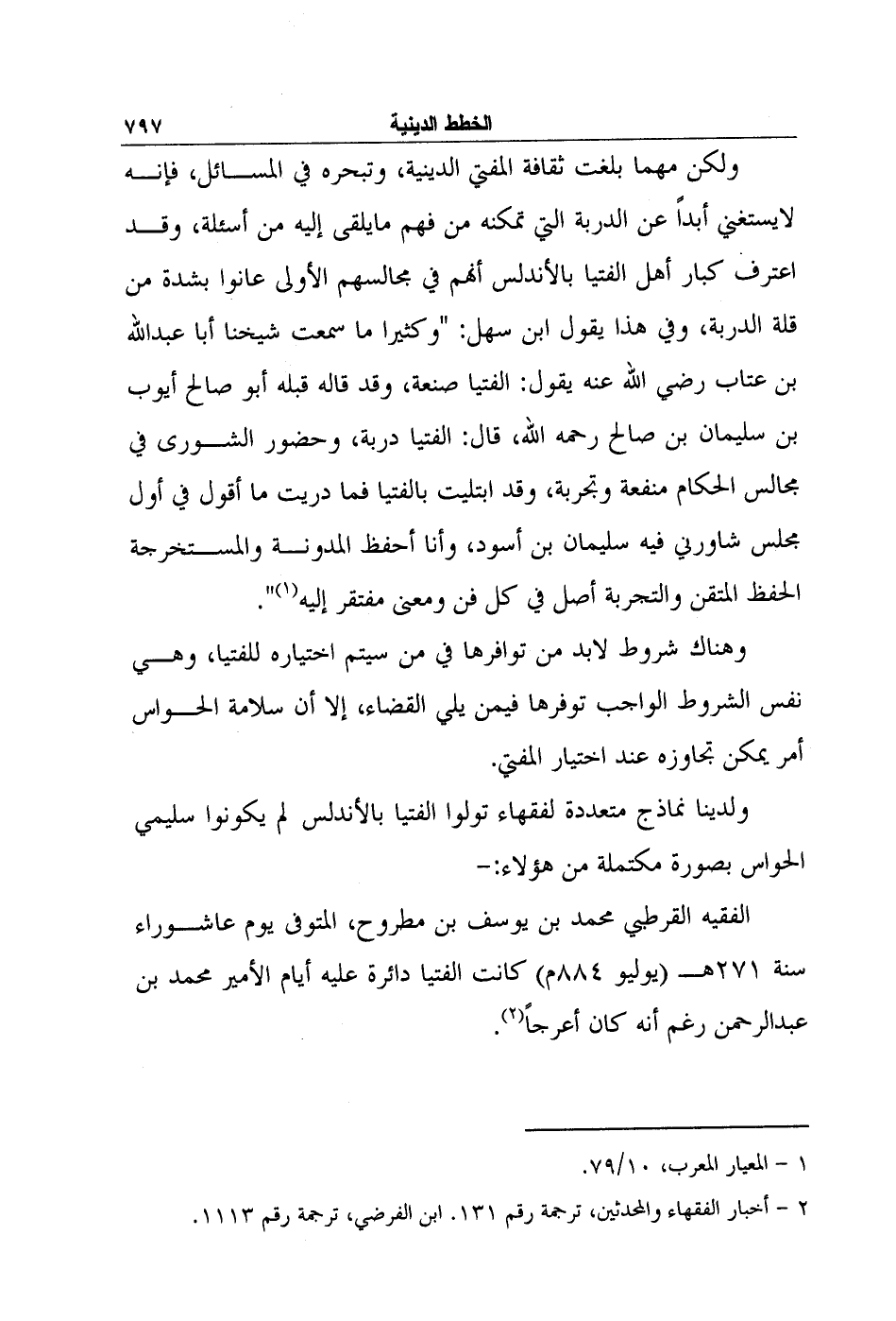 الفقيه القرطبي محمد بن يوسف بن مطروح، المتوفى يوم عاشوراء سنة 271هـ (يوليو 884م) كانت الفتيا دائرة عليه أيام الأمير محمد بن عبد الرحمن رغم أنه كان أعرجاً2.