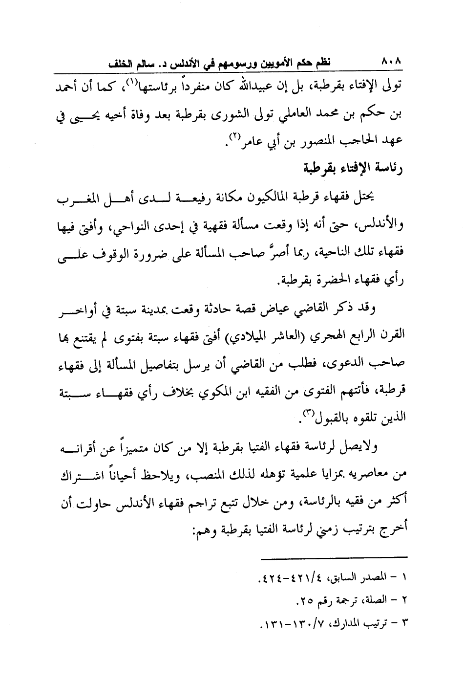 ولا يصل لرئاسة فقهاء الفتيا بقرطبة إلا من كان متميزاً عن أقرانه من معاصريه بمزايا علمية تؤهله لذلك المنصب، ويلاحظ أحياناً اشتراك أكثر من فقيه بالرئاسة، ومن خلال تتبع تراجم فقهاء الأندلس حاولت أن أخرج بترتيب زمني لرئاسة الفتيا بقرطبة وهم: