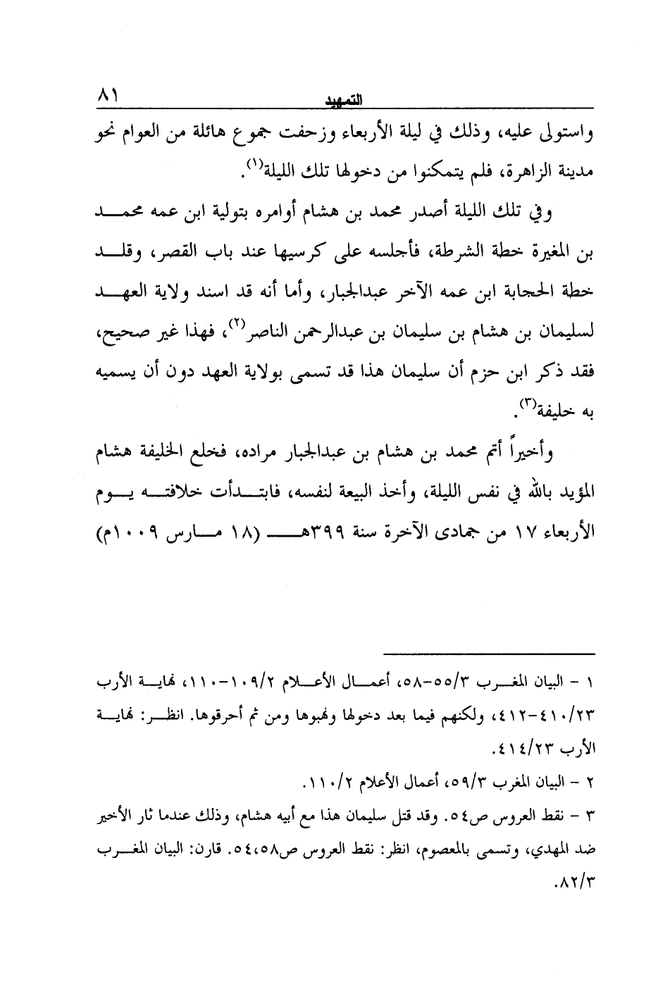 وفي تلك الليلة أصدر محمد بن هشام أوامره بتولية ابن عمه محمد بن المغيرة خطة الشرطة، فأجلسه على كرسيها عند باب القصر، وقلد خطة الحجابة ابن عمه الآخر عبد الجبار، وأما أنه قد اسند ولاية العهد لسليمان بن هشام بن سليمان بن عبد الرحمن الناصر2، فهذا غير صحيح، فقد ذكر ابن حزم أن سليمان هذا قد تسمى بولاية العهد دون أن يسميه به خليفة3.
