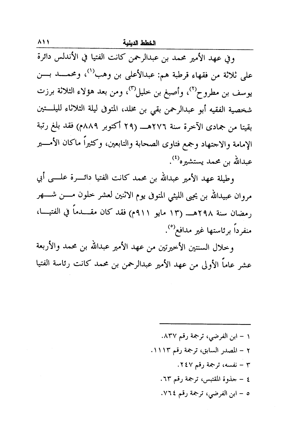 وفي عهد الأمير محمد بن عبد الرحمن كانت الفتيا في الأندلس دائرة على ثلاثة من فقهاء قرطبة هم: عبد الأعلى بن وهب1، ومحمد بن يوسف بن مطروح2، وأصبغ بن خليل3، ومن بعد هؤلاء الثلاثة برزت شخصية الفقيه أبو عبد الرحمن بقي بن مخلد، المتوفى ليلة الثلاثاء لليلتين بقيتا من جمادى الآخرة سنة 276هـ (29 أكتوبر 889م) فقد بلغ رتبة الإمامة والاجتهاد وجمع فتاوى الصحابة والتابعين، وكثيراً ما كان الأمير عبد الله بن محمد يستشيره4.