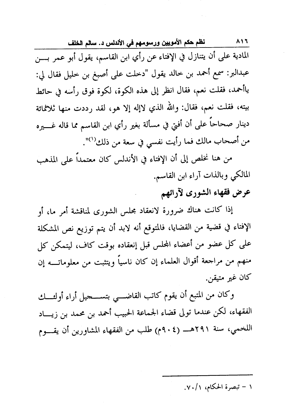 من هنا نخلص إلى أن الإفتاء في الأندلس كان معتمداً على المذهب المالكي وبالذات آراء ابن القاسم.