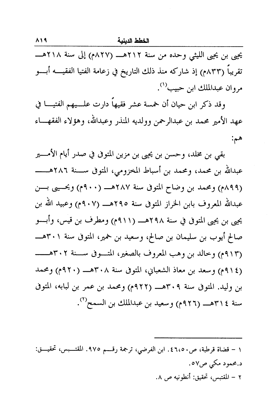 يحيى بن يحيى الليثي وحده من سنة 212هـ (827م) إلى سنة 218هـ تقريباً (833م) إذ شاركه منذ ذلك التاريخ في زعامة الفتيا الفقيه أبو مروان عبد الملك ابن حبيب1.