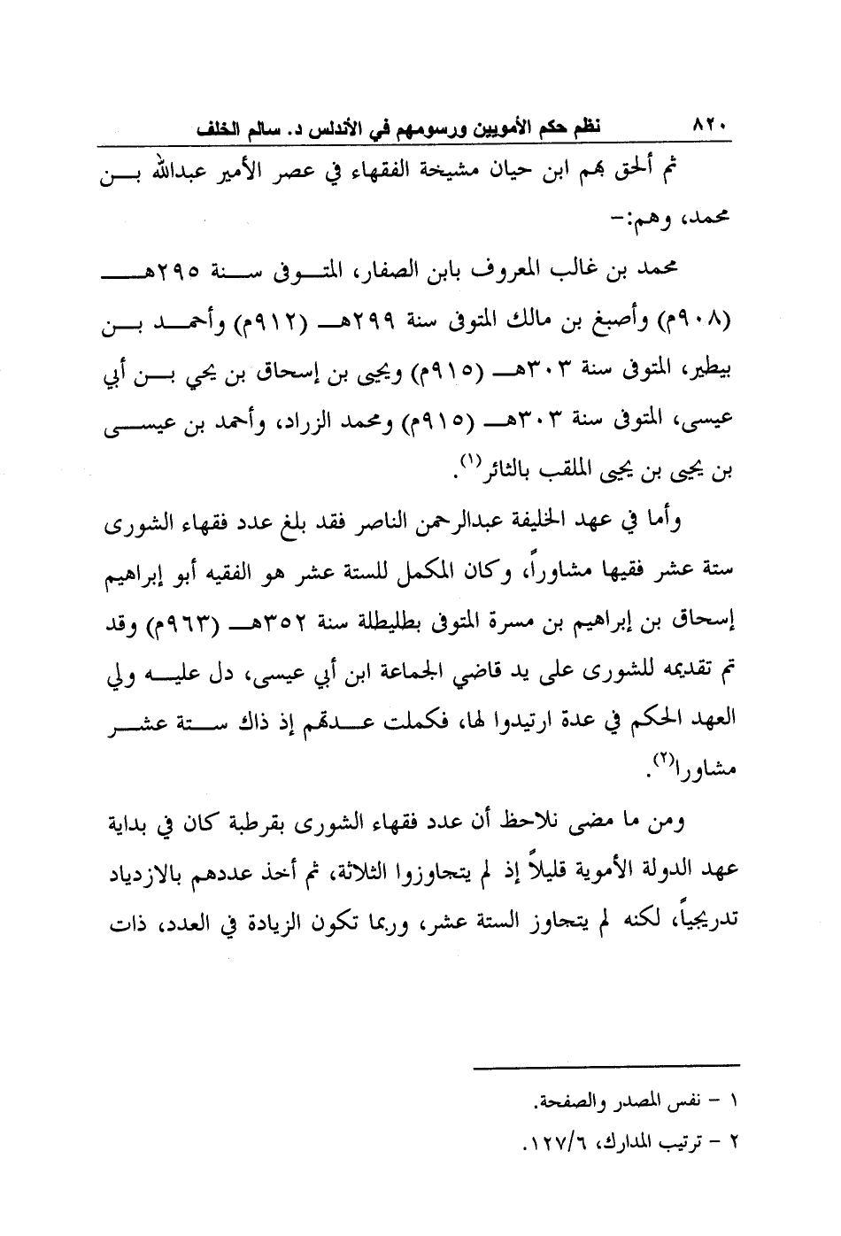 وأما في عهد الخليفة عبد الرحمن الناصر فقد بلغ عدد فقهاء الشورى ستة عشر فقيها مشاوراً، وكان المكمل للستة عشر هو الفقيه أبو إبراهيم إسحاق بن إبراهيم بن مسرة المتوفى بطليطلة سنة 352هـ (963م) وقد تم تقديمه للشورى على يد قاضي الجماعة ابن أبي عيسى، دل عليه ولي العهد الحكم في عدة ارتيدوا لها، فكملت عدتهم إذ ذاك ستة عشر مشاورا2.