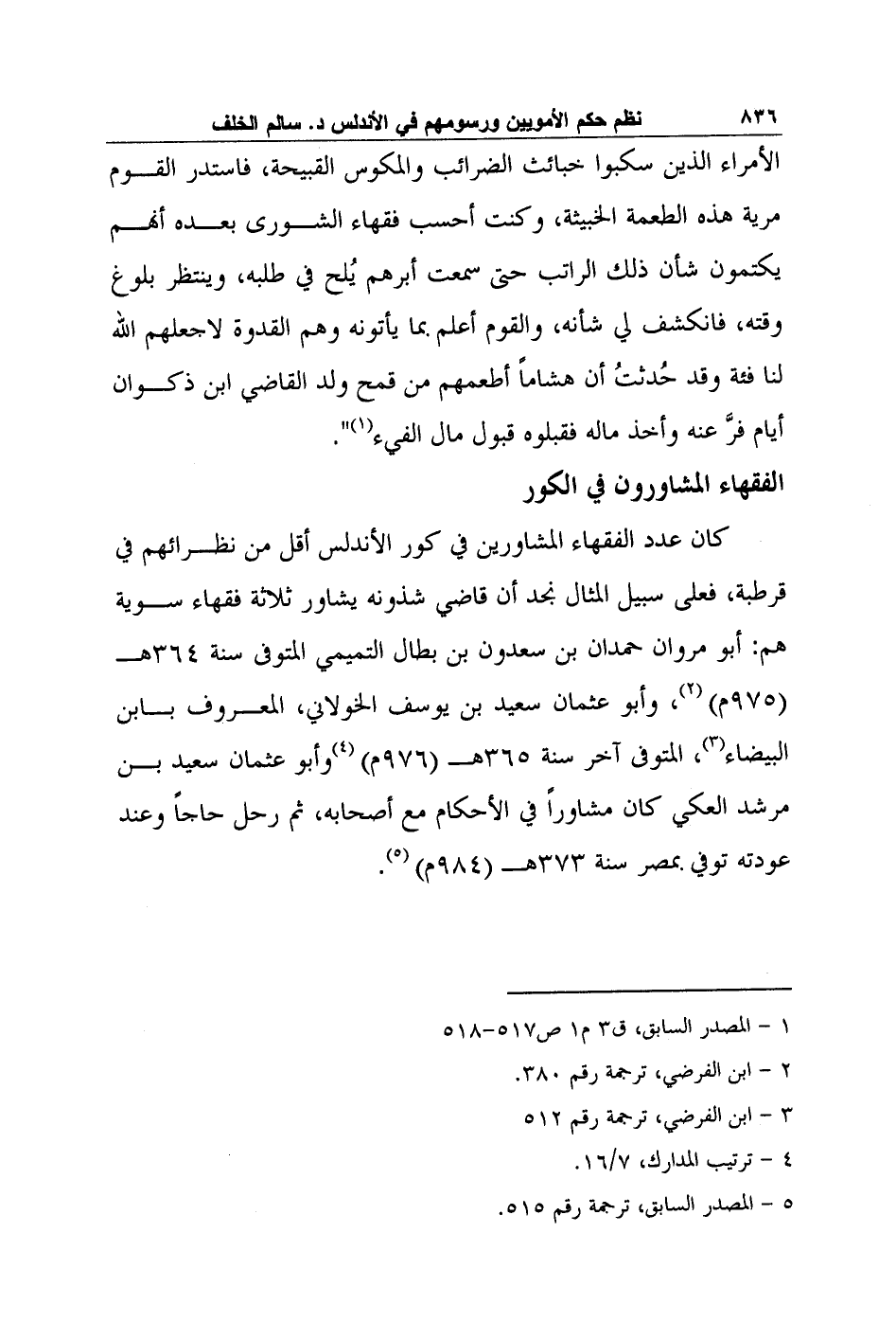 الأمراء الذين سكبوا خبائث الضرائب والمكوس القبيحة، فاستدر القوم مرية هذه الطعمة الخبيثة، وكنت أحسب فقهاء الشورى بعده أنهم يكتمون شأن ذلك الراتب حتى سمعت أبرهم يُلح في طلبه، وينتظر بلوغ وقته، فانكشف لي شأنه، والقوم أعلم بما يأتونه وهم القدوة لا جعلهم الله لنا فئة وقد حُدثتُ أن هشاماً أطعمهم من قمح ولد القاضي ابن ذكوان أيام فرَّ عنه وأخذ ماله فقبلوه قبول مال الفيء1".