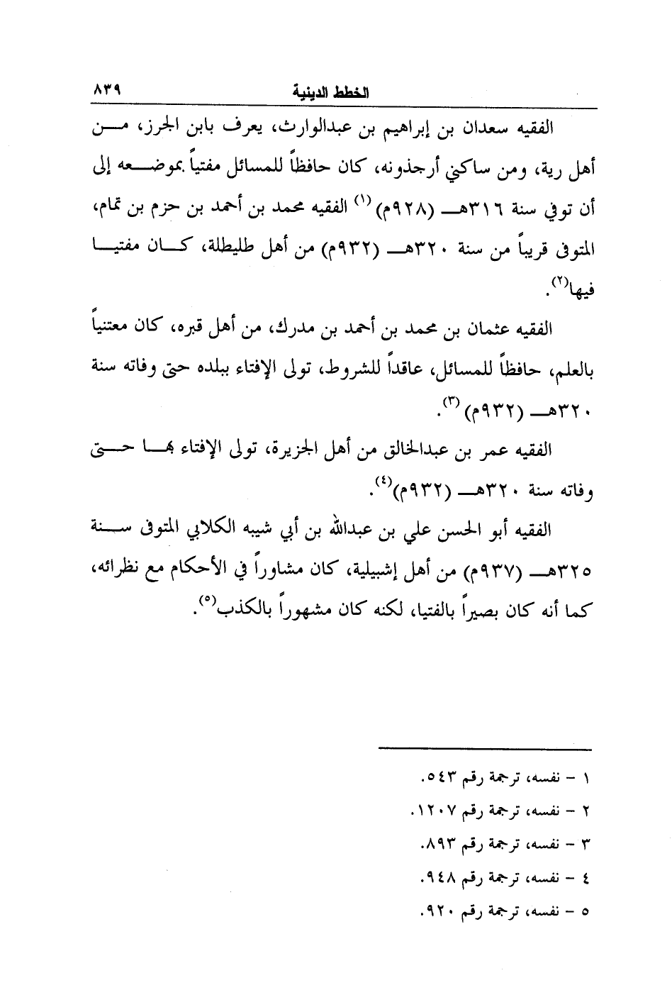 الفقيه سعدان بن إبراهيم بن عبد الوارث، يعرف بابن الجرز، من أهل رية، ومن ساكني أرجذونه، كان حافظاً للمسائل مفتياً بموضعه إلى أن توفي سنة 316هـ (928م) 1 الفقيه محمد بن أحمد بن حزم بن تمام، المتوفى قريباً من سنة 320هـ (932م) من أهل طليطلة، كان مفتيا فيها2.