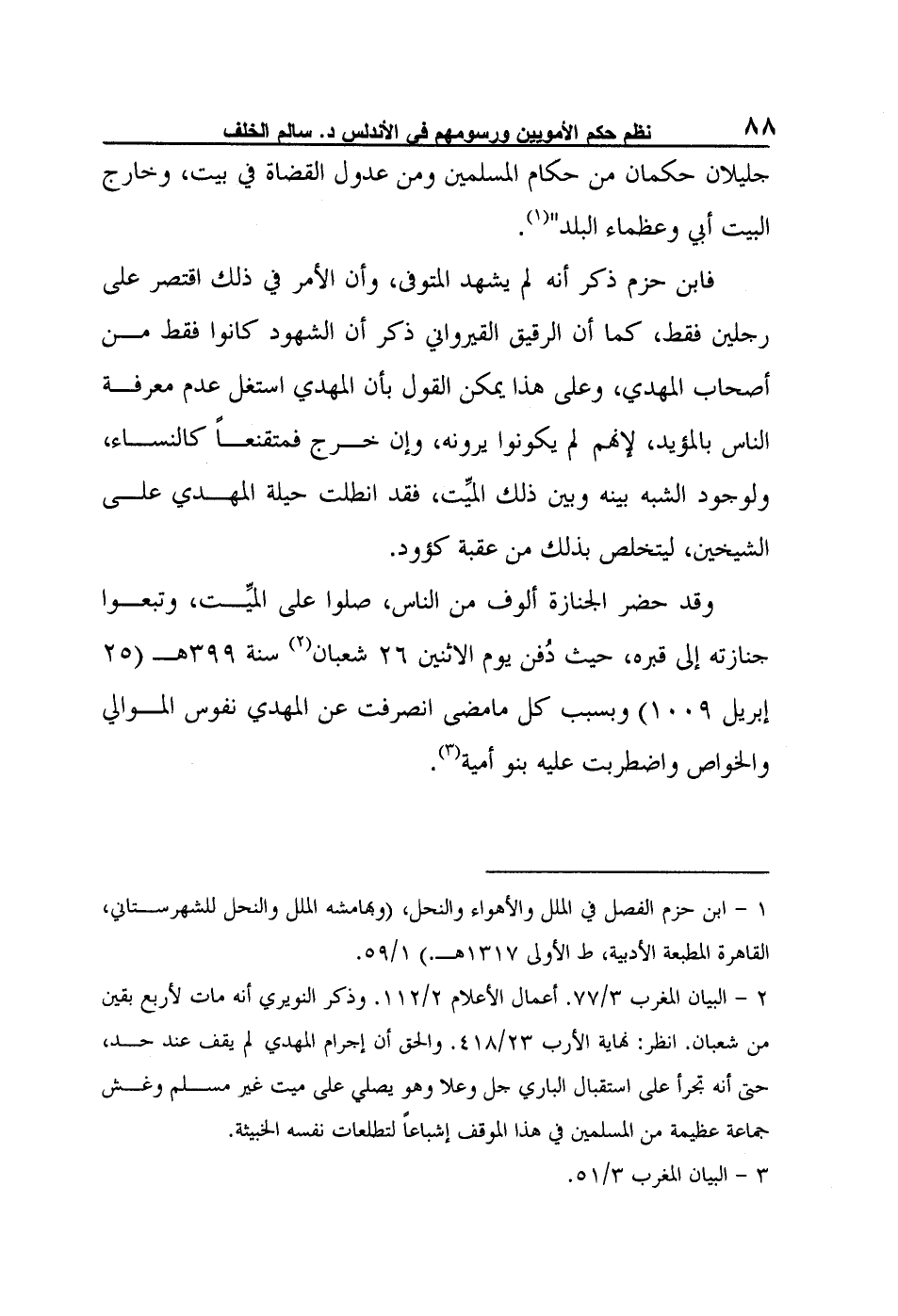 2- البيان المغرب 3/77. أعمال الأعلام 2/112. وذكر النويري أنه مات لأربع بقين من شعبان. انظر: نهاية الأرب 23/418. والحق أن إجرام المهدي لم يقف عند حد، حتى أنه تجرأ على استقبال الباري جل وعلا وهو يصلي على ميت غير مسلم وغش جماعة عظيمة من المسلمين في هذا الموقف إشباعاً لتطلعات نفسه الخبيثة.
