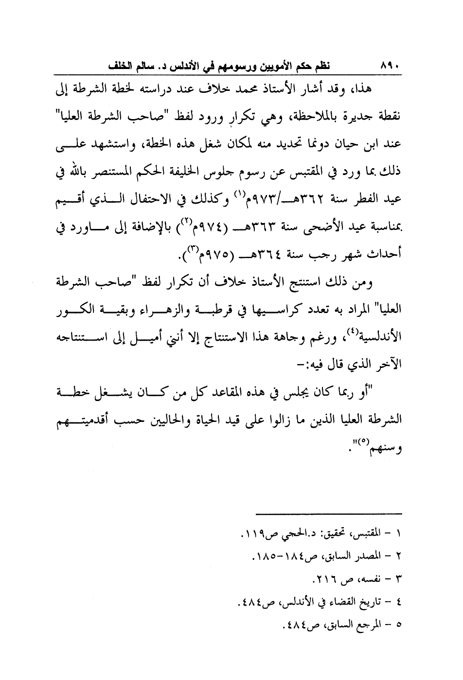 ومن ذلك استنتج الأستاذ خلاف أن تكرار لفظ "صاحب الشرطة العليا" المراد به تعدد كراسيها في قرطبة والزهراء وبقية الكور الأندلسية4، ورغم وجاهة هذا الاستنتاج إلا أنني أميل إلى استنتاجه الآخر الذي قال فيه: