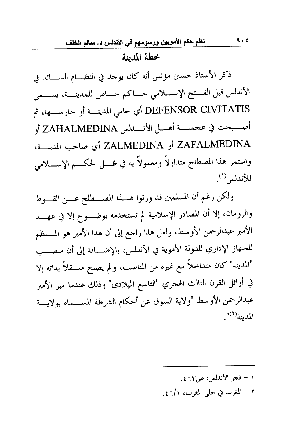 ذكر الأستاذ حسين مؤنس أنه كان يوجد في النظام السائد في الأندلس قبل الفتح الإسلامي حاكم خاص للمدينة، يسمى DEFENSOR CIVITATIS أي حامي المدينة أو حارسها، ثم أصبحت في عجمية أهل الأندلس ZAHALMEDINA أو ZAFALMEDINA أو ZALMEDINA أي صاحب المدينة، واستمر هذا المصطلح متداولاً ومعمولاً به في ظل الحكم الإسلامي للأندلس1.