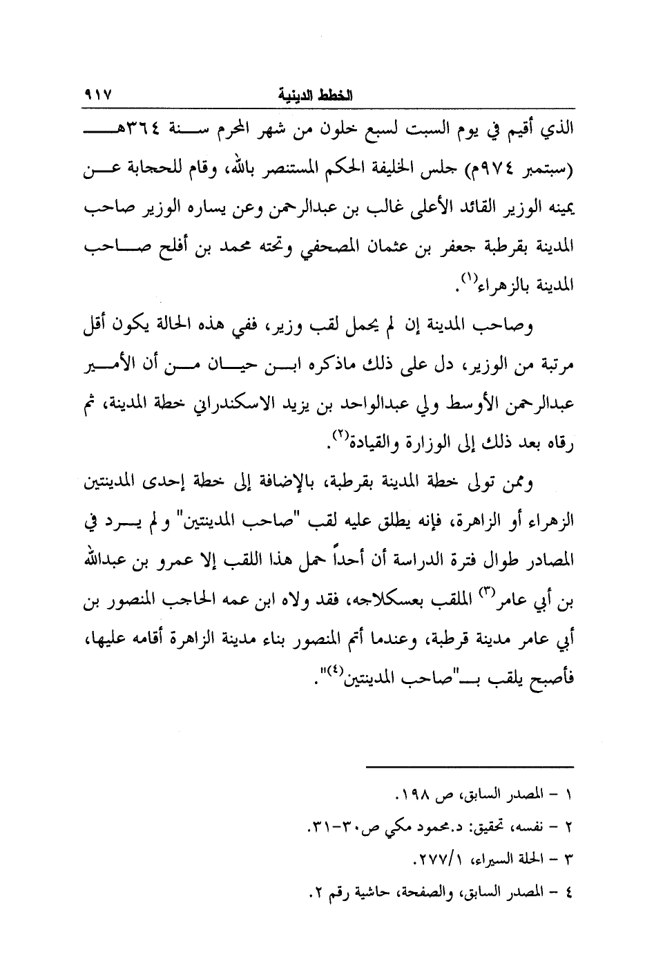 وصاحب المدينة إن لم يحمل لقب وزير، ففي هذه الحالة يكون أقل مرتبة من الوزير، دل على ذلك ما ذكره ابن حيان من أن الأمير عبد الرحمن الأوسط ولي عبد الواحد بن يزيد الاسكندراني خطة المدينة، ثم رقاه بعد ذلك إلى الوزارة والقيادة2.