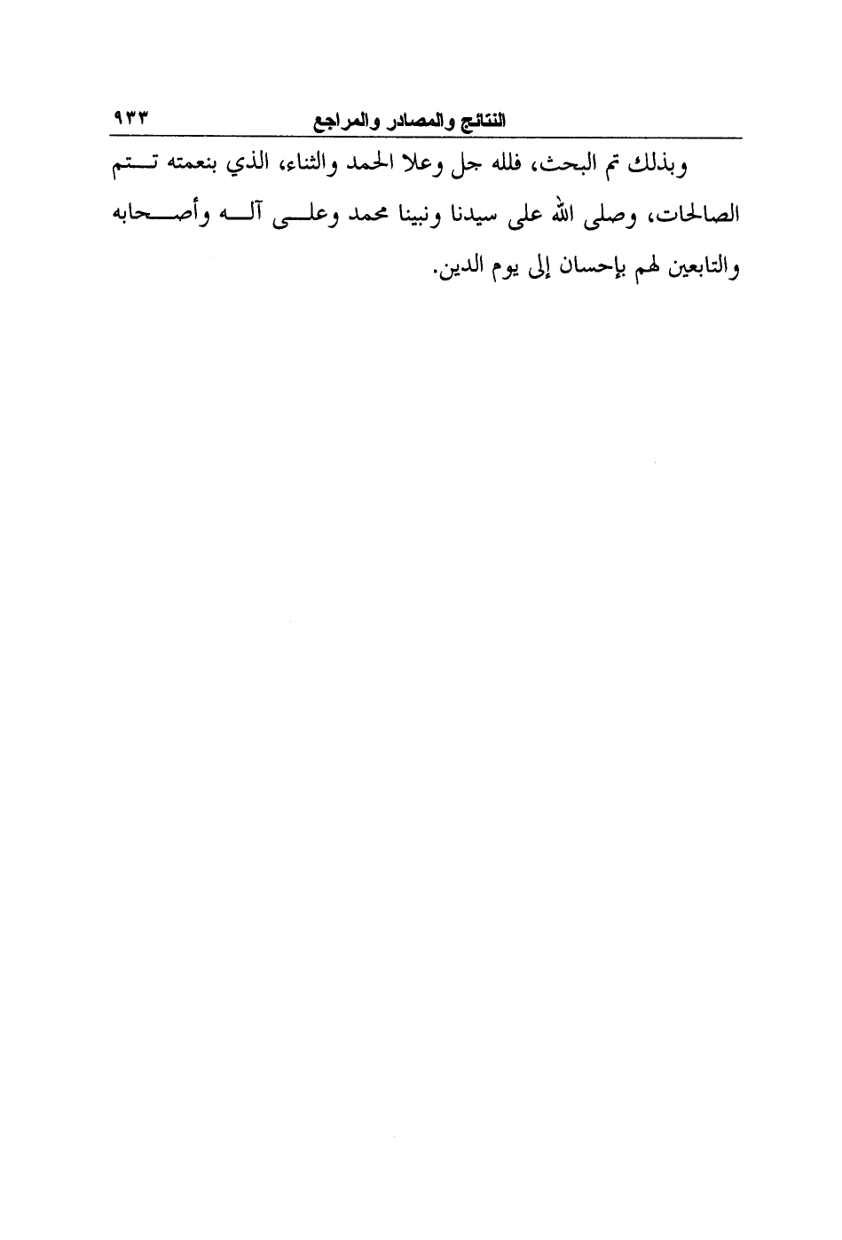 وبذلك تم البحث، فلله جل وعلا الحمد والثناء، الذي بنعمته تتم الصالحات، وصلى الله على سيدنا ونبينا محمد وعلى آله وأصحابه والتابعين لهم بإحسان إلى يوم الدين.