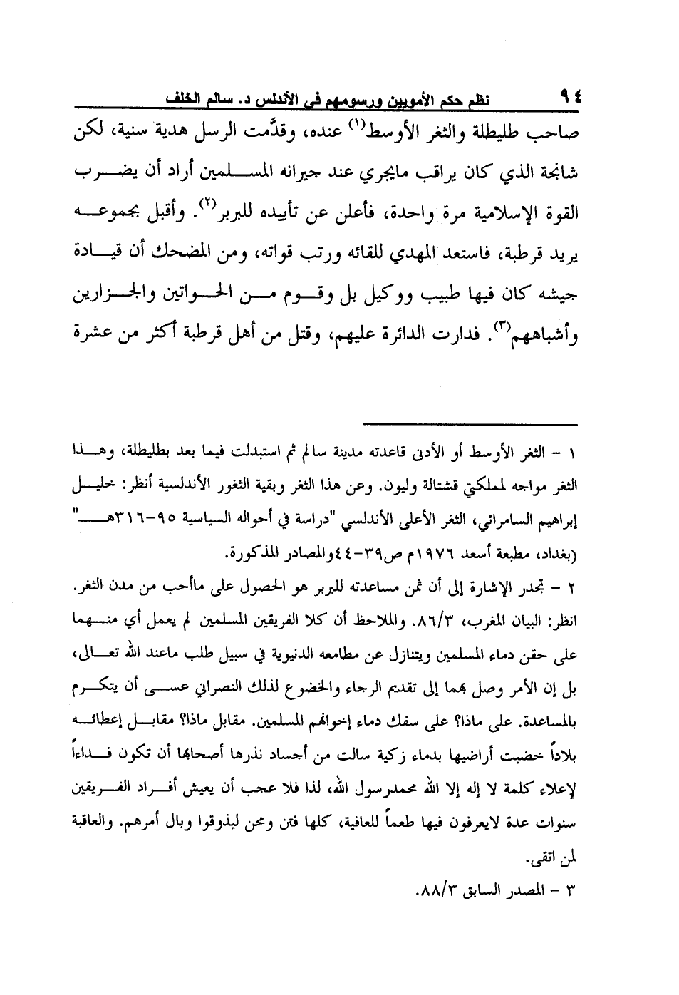 2- تجدر الإشارة إلى أن ثمن مساعدته للبربر هو الحصول على ما أحب من مدن الثغر. انظر: البيان المغرب، 3/86. والملاحظ أن كلا الفريقين المسلمين لم يعمل أي منهما على حقن دماء المسلمين ويتنازل عن مطامعه الدنيوية في سبيل طلب ما عند الله تعالى، بل إن الأمر وصل بهما إلى تقديم الرجاء والخضوع لذلك النصراني عسى أن يتكرم بالمساعدة. على ماذا؟ على سفك دماء إخوانهم المسلمين. مقابل ماذا؟ مقابل إعطائه بلاداً خضبت أراضيها بدماء زكية سالت من أجساد نذرها أصحابها أن تكون فداءاً لإعلاء كلمة لا إله إلا الله محمد رسول الله، لذا فلا عجب أن يعيش أفراد الفريقين سنوات عدة لا يعرفون فيها طعماً للعافية، كلها فتن ومحن ليذوقوا وبال أمرهم. والعاقبة لمن اتقى.
