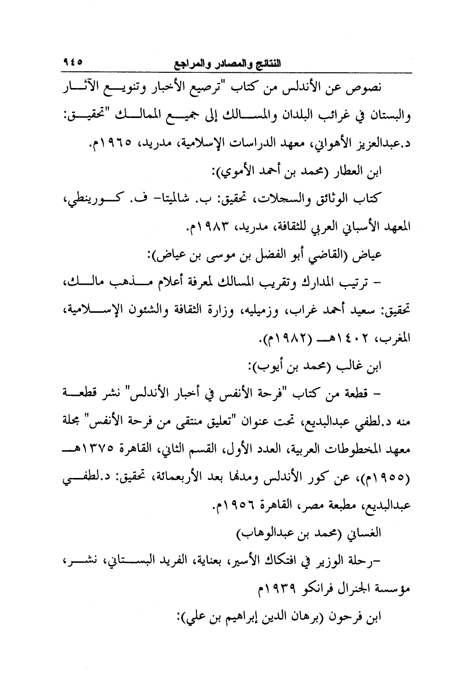 - ترتيب المدارك وتقريب المسالك لمعرفة أعلام مذهب مالك، تحقيق: سعيد أحمد غراب، وزميليه، وزارة الثقافة والشئون الإسلامية، المغرب، 1402هـ (1982م) .