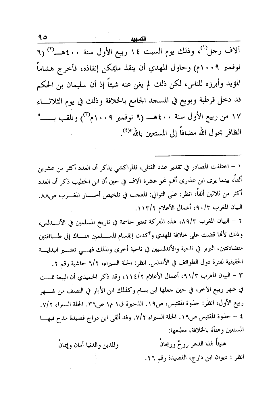 3- البيان المغرب 3/91، أعمال الأعلام 2/114، وقد ذكر الحميدي أن البيعة تمت في شهر ربيع الآخر، في حين جعلها ابن بسام وكذلك ابن الأبار في النصف من شهر ربيع الأول، انظر: جذوة المقتبس، ص19. الذخيرة ق1 م1 ص36. الحلة السيراء 2/7.
