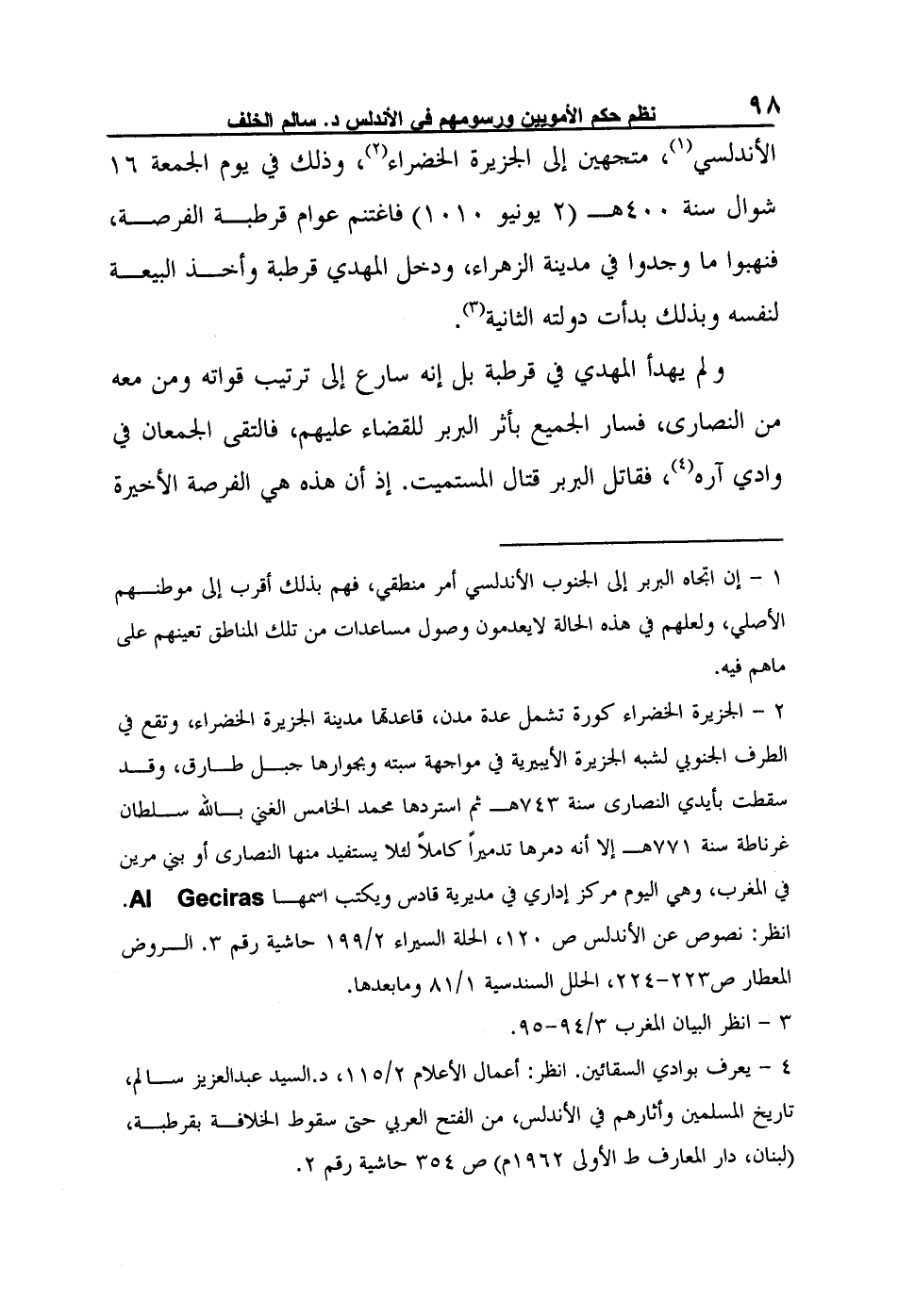 2- الجزيرة الخضراء كورة تشمل عدة مدن، قاعدتها مدينة الجزيرة الخضراء، وتقع في الطرف الجنوبي لشبه الجزيرة الأيبيرية في مواجهة سبته وبجوارها جبل طارق، وقد سقطت بأيدي النصارى سنة 743هـ ثم استردها محمد الخامس الغني بالله سلطان غرناطة سنة 771هـ إلا أنه دمرها تدميراً كاملاً لئلا يستفيد منها النصارى أو بني مرين في المغرب، وهي اليوم مركز إداري في مديرية قادس ويكتب اسمها Al Geciras. انظر: نصوص عن الأندلس ص 120، الحلة السيراء 2/199 حاشية رقم 3. الروض المعطار ص223-224، الحلل السندسية 1/81 وما بعدها.
