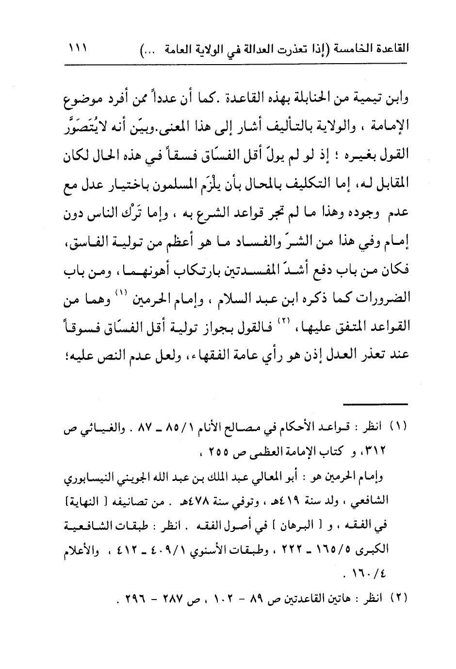 ١ انظر: قواعد الأحكام في مصالح الأنام ١/٨٥-٨٧. والغياثي ص٣١٢، وكتاب الإمامة العظمى ص٢٥٥.