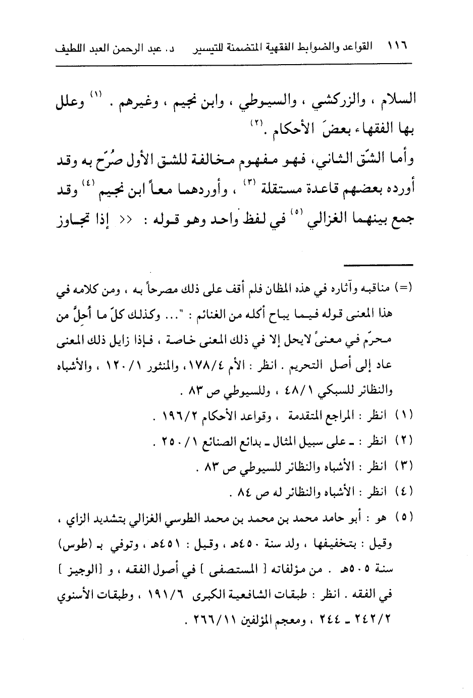 وأما الشق الثاني، فهو مفهوم مخالفة للشق الأول صُرّح به وقد أورده بعضهم قاعدة مستقلة٣، وأوردهما معا ابن نجيم٤ وقد جمع بينهما الغزالي٥ في لفظ واحد وهو قوله: "إذا تجاوز