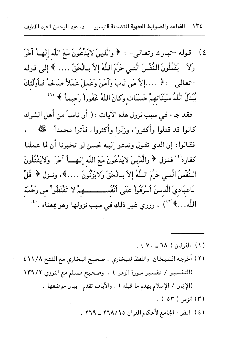٤) قوله تبارك وتعالى: {وَالَّذِينَ لا يَدْعُونَ مَعَ اللَّهِ إِلَهاً آخَرَ وَلا يَقْتُلُونَ النَّفْسَ الَّتِي حَرَّمَ اللَّهُ إِلاّ بِالْحَقِّ ... } إلى قوله تعالى: {إِلاَّ مَنْ تَابَ وَآمَنَ وَعَمِلَ عَمَلاً صَالِحاً فَأُولَئِكَ يُبَدِّلُ اللَّهُ سَيِّئَاتِهِمْ حَسَنَاتٍ وَكَانَ اللَّهُ غَفُوراً رَحِيماً} ١.