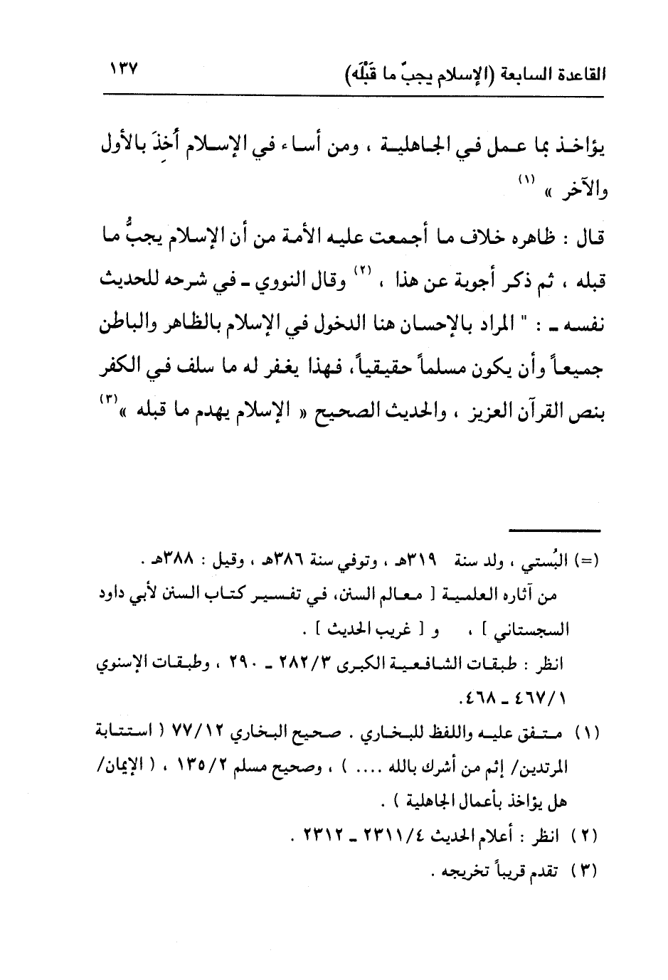 قال: "ظاهره خلاف ما أجمعت عليه الأمة من أن الإسلام يجب ما قبله، ثم ذكر اجوبة عن هذا"٢، وقال النووي في شرحه للحديث نفسه: "المراد بالإحسان هنا الدخول في الإسلام بالظاهر والباطن جميعا وأن يكون مسلما حقيقيا، فهذا يغفر له ما سلف في الكفر بنص القرآن العزيز، والحديث الصحيح "الإسلام يهدم ما قبله"٣